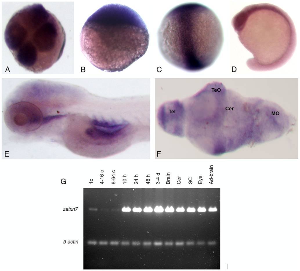 (A-F) In situ detection of zebrafish atxn7 transcripts on either whole mount embryos at the four-cell stage (A), or 3 (B), 8 (C), 16 (D), and 48 hpf (E) or dissected brain of 120 hpf embryos (F). (I) RT-PCR analysis of zebrafish atxn7 transcript accumulation in 1- (1 c), 4- to 16- (4–16 c), and 8- to 64-cell embryos (8–64 c), or 10 (10 h), 24 (24 h), 48 (48 h) and 72 to 96 hpf embryos (3–4 d) and dissected adult brain (Brain), cerebellum (Cer), spinal cord (SC), eye (Eye) and remaining tissues (Ad-brain). RT–PCR for β-actin is shown as a positive control. Abbreviations: Cer, cerebellum; MO, medulla oblongata; TeO, tectum opticum; Tel, telencephalon.