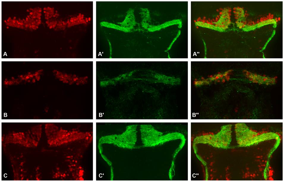 Dorsal views of dissected brains from 5 dpf 1 pmol mmMOzatxnAUG (A, A′ and A′′) and 0.3 pmol MOzatxn7SPL morphants (B, B′ and B′′) and age-matched 0.3 pmol MOzatxn7SPL morphant co-injected with human atxn7 mRNA (2 fmol) (C, C′ and C′′). Pav7 immunostaining of Purkinje cells (A, B and C) and Vglut1 immunostaining of granule cells (A′, B′ and C′). Anterior is to the left. Merge images of the photographs A and A′ (A′′), B and B′ (B′′), and C and C′ (C′′).