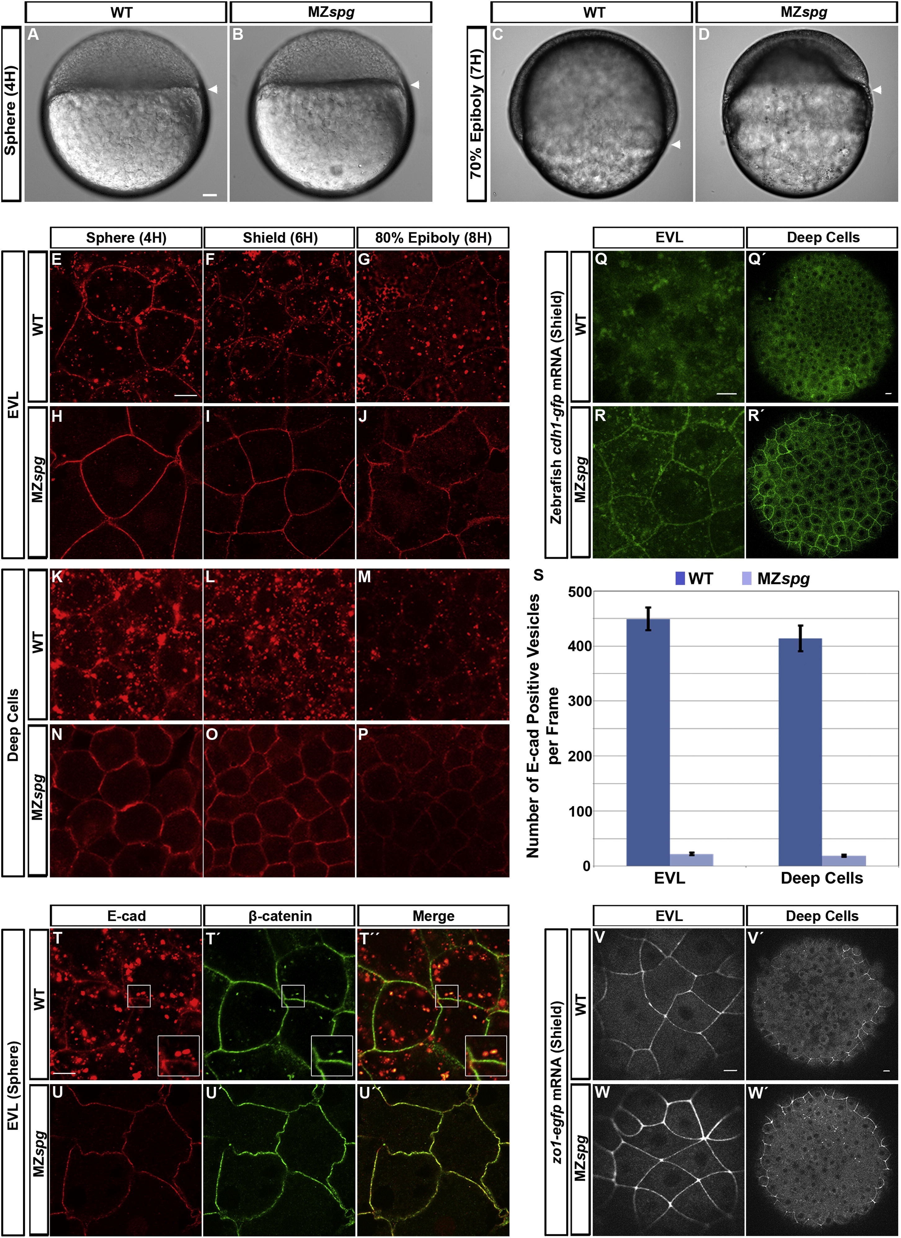 Fig. 1 Pou5f1 Controls Subcellular Localization of E-cad(A–D) Live WT and MZspg embryos at sphere and 70% epiboly stages. Arrowheads indicate vegetal front of blastoderm. Lateral views, animal pole to the top. Scale bar, 50 μm.(E–P) Confocal images of anti-E-cad ECD immunofluorescence whole-mount embryos reveal E-cad subcellular localization in WT and MZspg embryos; stages as indicated.(Q–R′) Confocal images of GFP-tagged E-cad expressed from injected mRNA. Live embryos were imaged at shield stage.(S) Quantification of the number of E-cad-positive intracellular vesicles at shield stage (n = 26 embryos each for WT and MZspg. Error bars show SEM; p < 0.001).(T–U3) Coimmunofluorescence of E-cad (red) and β-catenin (green) in WT and MZspg embryos at sphere stage in fixed whole mounts. Insets in (T)–(T′′′) show higher magnification.(V–W′) Confocal images ZO-1-EGFP signal expressed from injected mRNA (shield stage).(E–R′) and (T–W′) Animal views. Scale bars, 10 μm. See also Figure S1 and Movie S1.