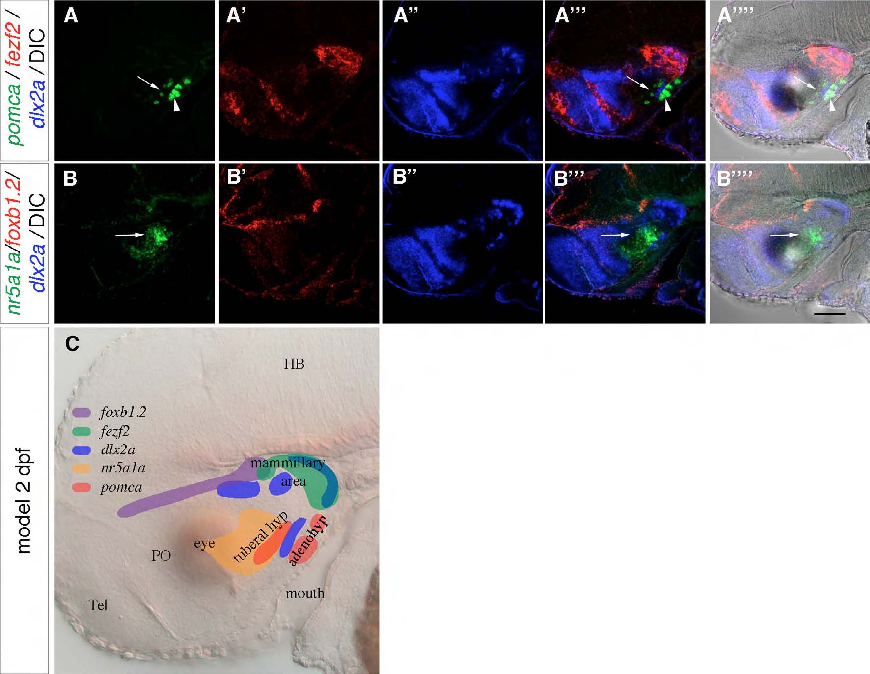 Fig. S1 The tuberal hypothalamus is ventral to the mammillary area. (A-B-′′′ ′) Three-color FISH detecting the expression of pomca, fezf2, dlx2a, nr5a1a and foxb1.2 in 2-dpf wild-type embryos with DIC (A-′′′ ′,B-′′′ ′). (A-A-′′′ ′) The hypothalamic expression of pomca (arrows) is anterior to its adenohypophyseal expression (arrowheads) and ventral to the mammillary fezf2 signal. dlx2a is expressed between the tuberal hypothalamic and adenohypophyseal pomca expression domains. (B-B-′′′ ′) nr5a1a expression (arrows) is ventral to the foxb1.2 expression. (C) Scheme showing relative expression of the marker genes to distinguish between tuberal and mammillary regions. Lateral views of maximum projections of 10 μm confocal z-stacks are shown. Tel, telencephalon; HB, hindbrain; PO, preoptic area; tuberal hyp, tuberal hypothalamus; adenohyp, adenohypophysis. Scale bar: 100 μm.