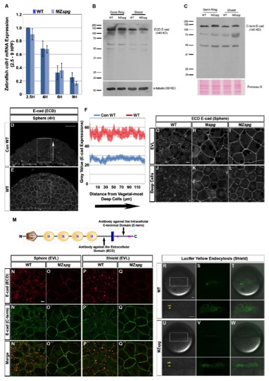 (B-C) E-cad protein amounts in germ ring and shield stage whole embryo extracts analyzed by Western blot analysis using E-cad antibodies to extracellular-domain (B) and intracellular-domain (C). E-cad protein amounts of those two stages are not significantly different in WT and MZspg embryos. E-cad is detected as most prominent protein band at 140 KD. α-tubulin detected by antibody and Ponceau S were used as loading controls.