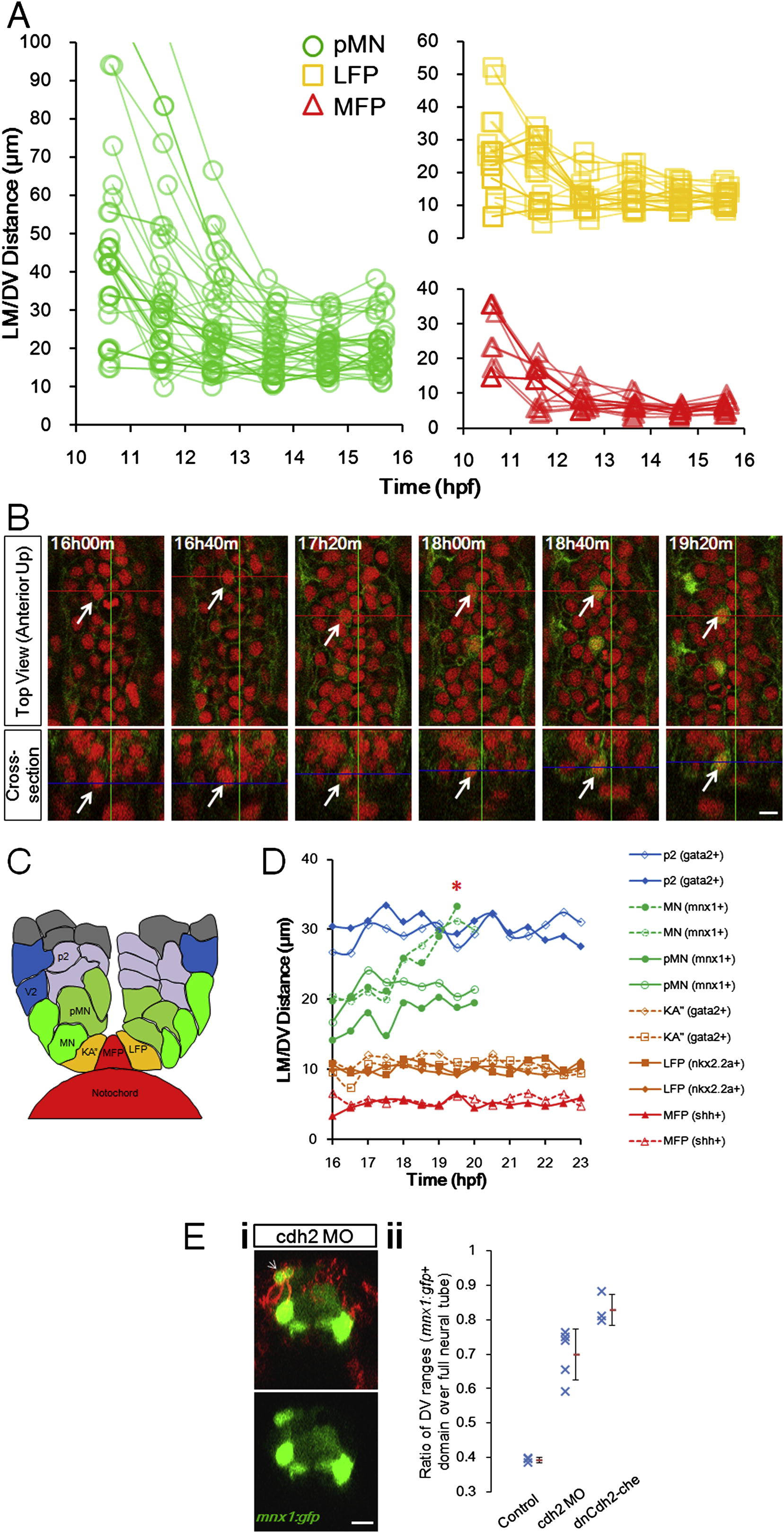 Fig. S5 Domain Boundaries Remain Stable after 16 hpf, Cell-type Verifications by Additional Markers, and Additional cdh2 Perturbation Data, Related to Figure 5 (A) Plots by cell type from Figure 5B.(B) LFP cell type confirmation by later stage time-lapse of tg(gata2:gfp) embryos. KA” neurons (gata2:gfp+) are born from the LFP domain among LFP progenitors (nkx2.2a:mgfp+, Figures S1A and S3C; Huang et al., 2012). Note that the tracked LFP cell stays in stable location over time and becomes gata2:gfp+ by 18h40m. All scale bars: 10 μm.(C) Schematic illustration of cell positions in the final pattern. Enlarged and annotated from Figure 1Di.(D) Later stage tracking with various markers. Asterisk: Maturing MNs leave pMN domain and migrate laterally, effectively increasing the LM/DV distance. Neuron movements happen after progenitor domain formation and are distinct from progenitor movements. Cell positions are otherwise stable in this time window indicating stability of established pattern. See also Movie S6.(E) (i).Cdh2 perturbed embryo as in Figure 5F. Example of ectopically localized pMNs that are cherry+ (arrow). Both injected and uninjected (see also Figure 5F) pMNs might become misplaced, suggesting the pattern disruption caused by Cdh2 MO is cell nonautonomous. (ii). Cdh2 perturbed embryos have wider distribution of pMNs. The ratio between the maximum DV range of the mnx1:gfp+ cell cross-sectional distribution over the full length of the neural tube at 24hpf was measured. dnCdh2-che: dominant negative Cdh2-cherry fusion. Blue marks: measurement on one embryo. Red marks: average ratios (±s.d.).