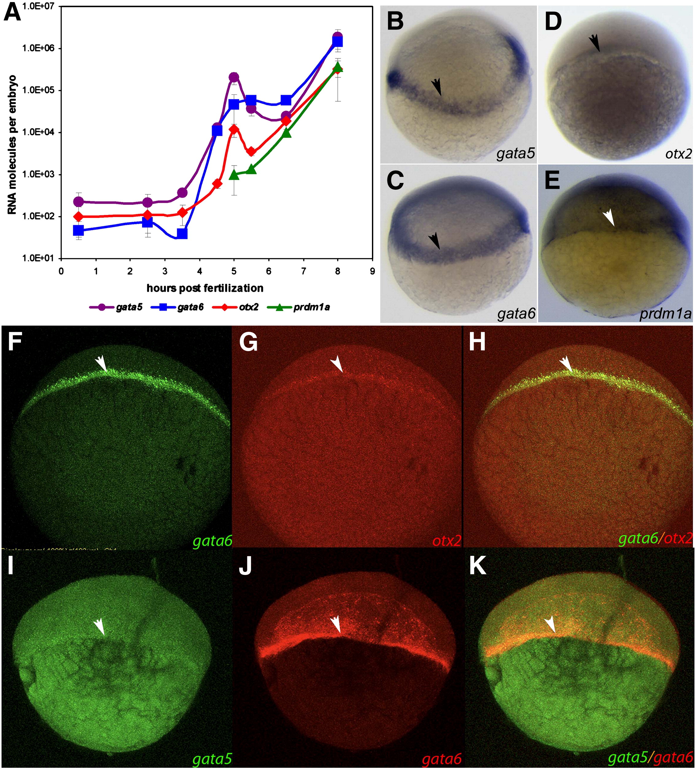 Fig. 1 Temporal and spatial expression profiles of gata5, gata6, otx2 and prdm1a. (A) Quantitative expression profiles of gata5, gata6, otx2 and prdm1a determined by using Q-PCR. The X-axis represents RNA molecules per embryo defined by Q-PCR. RNA was isolated from embryos at different time points, and the absolute molecular numbers per embryo are shown as a purple line for gata5, a blue line for gata6, a red line for otx2, and a green line for prdm1a. The experiments were conducted in triplicate, and the standard deviation is shown as a bar extending to both sides of the mean. (B–E) In situ hybridization of gata5, gata6, otx2 and prdm1a in wild-type embryos at 5 hpf. gata5 and gata6 are expressed in the mesendoderm and the YSL at 5 hpf. otx2 is expressed in the blastoderm at 5 hpf, and prdm1a is expressed in the blastoderm and ectoderm. Arrow indicates the location of mesendoderm lineage at the margin of blastoderm. (F–K) Co-localization of otx2, gata5 and gata6 at 5 hpf double in situ hybridization for gata6 and otx2 (F, G, H) and gata5 and gata6 (I, J, K) in wild-type embryos at 5 hpf. (F) gata6 mRNA is indicated by green fluorescence. (G) otx2 mRNA is shown by red fluorescence. (H) Merged image of F and G, indicating the co-localization of gata6 and otx2 in the mesendoderm. (I) gata5 mRNA is indicated by green fluorescence. (J) gata6 mRNA is shown by red fluorescence. (K) Merged image of I and J indicating the co-localization of gata5 and gata6 in the mesendoderm. Arrow indicates the location of mesendoderm lineage at the margin of the blastoderm.