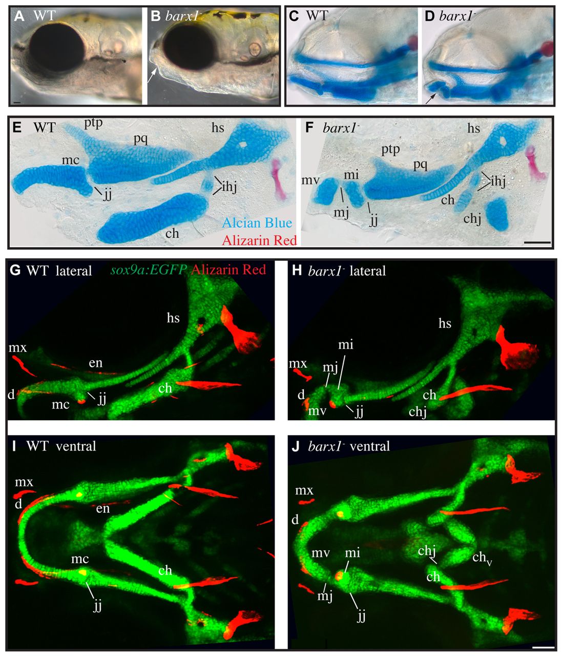 Fig. 1 Cartilage and dermal bone phenotypes present in barx1 mutant zebrafish. (A,B) Live 5 days post-fertilization (dpf) zebrafish larvae were imaged with transmitted light. Arrow indicates lower jaw divot. (C,D) 5 dpf zebrafish stained with Alcian Blue and Alizarin Red to label cartilage and bone were imaged with transmitted light. Eyes were removed to allow visualization of skeleton. Arrow indicates lower jaw skeletal gap. (E,F) 4 dpf Alcian Blue and Alizarin Red stained skeletons were dissected and imaged with transmitted light. (G-J) Confocal projections of live 6 dpf larvae with chondrocytes transgenically labeled with EGFP (sox9a:EGFP, green), and bone labeled with Alizarin Red. (A-H) Lateral views, anterior is towards the left, dorsal is upwards. (I,J) Ventral views, anterior is towards the left, whereas left is upwards. Arch 1 elements include the pterygoid process (ptp), palatoquadrate (pq) and Meckel’s (mc) cartilages. The jaw joint (j) and the ectopic Meckel’s joint (mj) are described in cellular detail below. The independent elements resulting from the ectopic arch 1 joint are referred to as Meckel’s cartilage ventral (mv) and Meckel’s cartilage intermediate (mi). Arch 1-derived dermal bones indicated are the dentary (d), maxilla (mx) and entopterygoid (en). Arch 2-derived cartilages include the ceratohyal (ch) and hyosymplectic (hs), which are divided by the interhyal joints (ihj) and the ectopic ceratohyal joint (chj). Scale bars: 50 μm.