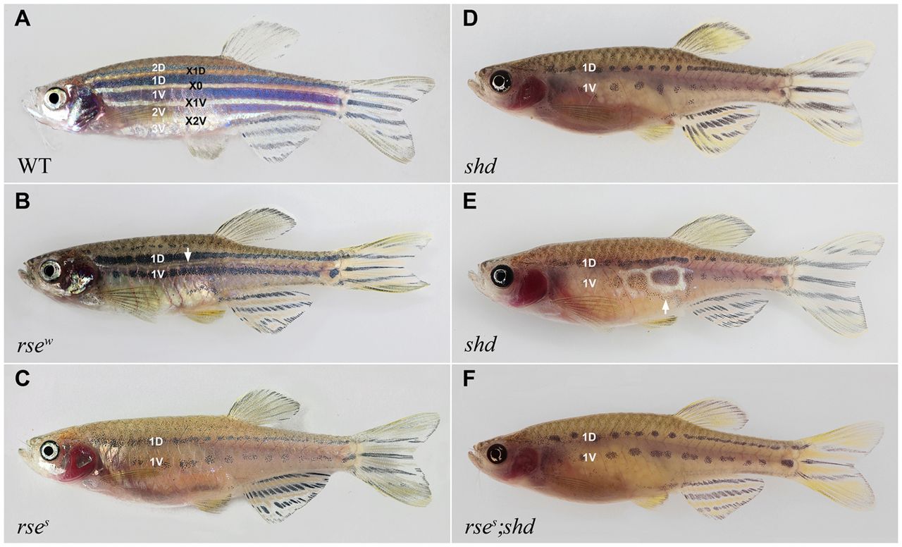 Fig. 1 Adult phenotypes of iridophore mutants. (A) Wild-type fish. To denote individual stripes, we follow the nomenclature of Parichy et al. (Parichy et al., 2009), which we have extended by naming the interstripes, the central interstripe being X0. Additional stripes and interstripes added dorsally and ventrally during development are numbered according to their sequence of appearance. (B,C) rse mutants. Weak (B) and strong (C) rse alleles show a reduction of iridophores and melanophores. In strong rse mutants (Fig. 1C), the dense S-iridophore zone in X0 is lacking, and S-iridophores spread thinly from X0 dorsally and ventrally over the melanophores. In the weaker allele, a small ridge of dense S-iridopores persists (B). There are at most four melanophore stripes compared with five in a typical wild-type adult. Stripe 2D is reduced or absent, 2V is better preserved and 1V stays more strictly in a wild-type position parallel to X0 in rse compared with shd (D). (D,E) shd mutants. The white arrow in E displays an escaper S-iridophore patch (Lopes et al., 2008). In close proximity, the number of melanophores is significantly increased. (F) Double mutant rse;shd. The phenotype is indistinguishable from that of shd mutants.