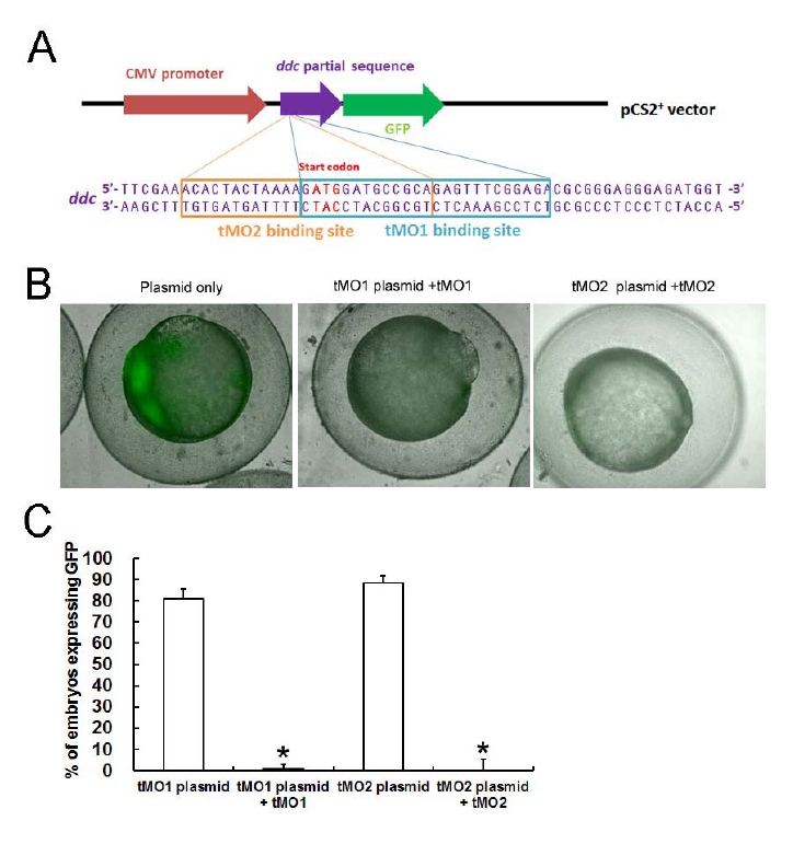 Efficiency testing of ddc translational blocking MOs. (A) A 303 bp partial sequence of ddc containing tMO1 or tMO2 targeting site (purple region) was inserted into a pCS2+ vector containing CMV promoter (brown region) and GFP (green region) sequences. The binding sequences for ddc tMO1 and tMO2 are shown below the construct map. (B) Embryos were co-injected with designated MO (5 ng) and MO efficiency testing plasmid (100 pg), examined by epifluorescent microscope under bright and dark fields. Representative superimposed images are shown. (C) Percentages of embryos showing GFP in different treatments are shown. Plasmid injected only group, n=106; tMO1,n=103; tMO2, N=64. * p <0.001.