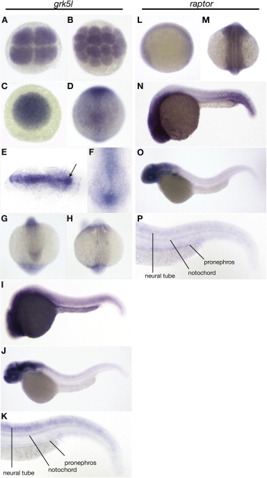 Expression analysis by in situ hybridization reveals an overlapping pattern for grk5l and raptor during early development.