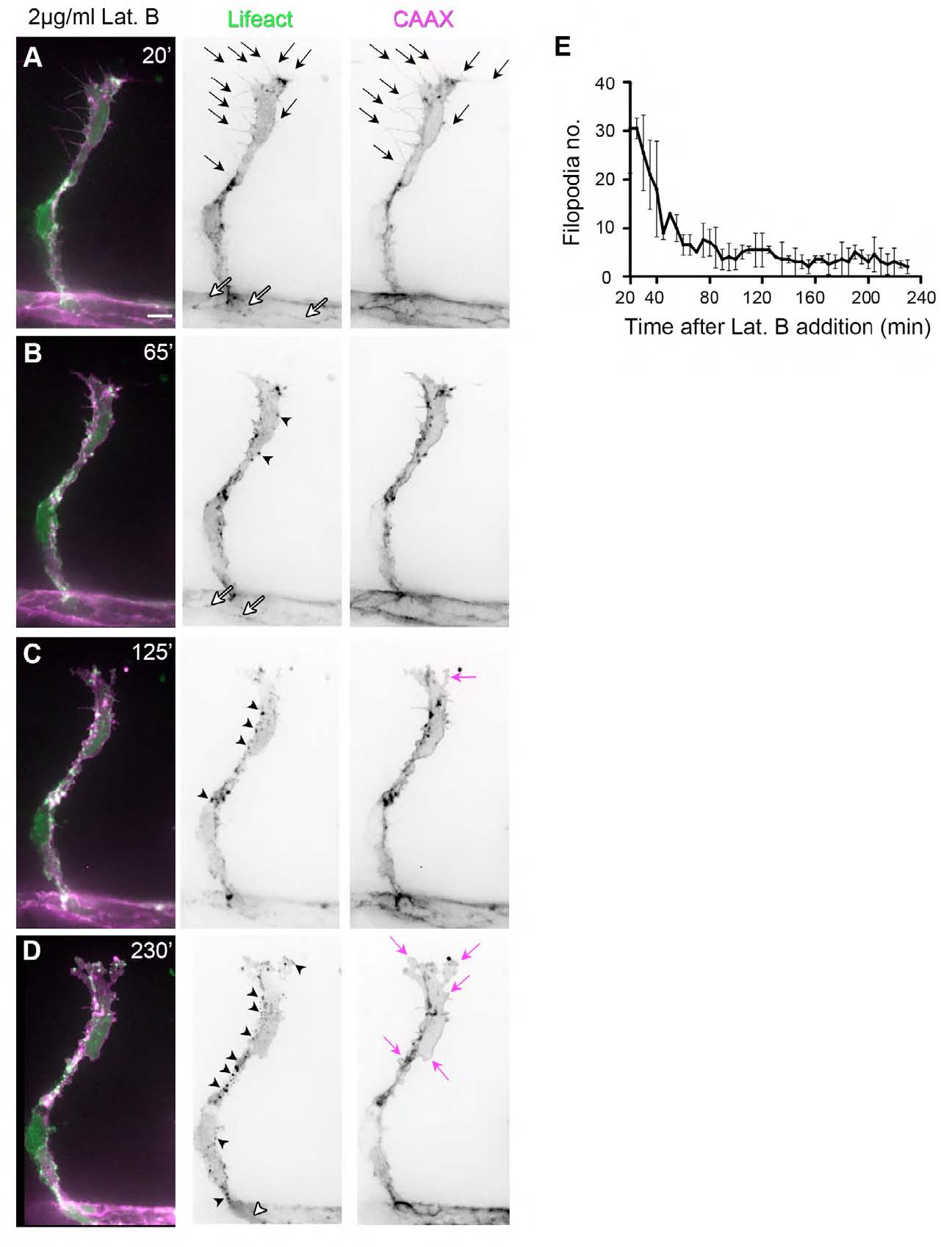 Fig. S4 Latrunculin B disrupts F-actin polymerisation and endothelial cell morphology. Tg(Fli1ep:Lifeact-EGFP); Tg(Kdr-l:ras- Cherry) s916 28.5 hpf embryos were treated with 2 μg/ml Lat. B. (A) At 20 minutes post-addition of Lat. B, endothelial tip cells of ISVs display multiple F-actin-filled filopodia (arrows) and junctional F-actin at the dorsal aorta (white arrows). (B-D) As drug treatment continued, fewer filopodia protrusions are observed. There is an increase in F-actin-positive puncta (black arrowheads) and loss of junctional F-actin (white arrowhead in D). Concomitant to perturbation of F-actin polymerisation, there is a change in EC morphology. The cell membrane becomes more convoluted at the cell body and at cell protrusions (magenta arrows). (E) Number of CAAX-positive filopodia after addition of 2 μg/ml Lat. B. n=2 ISVs from two embryos.