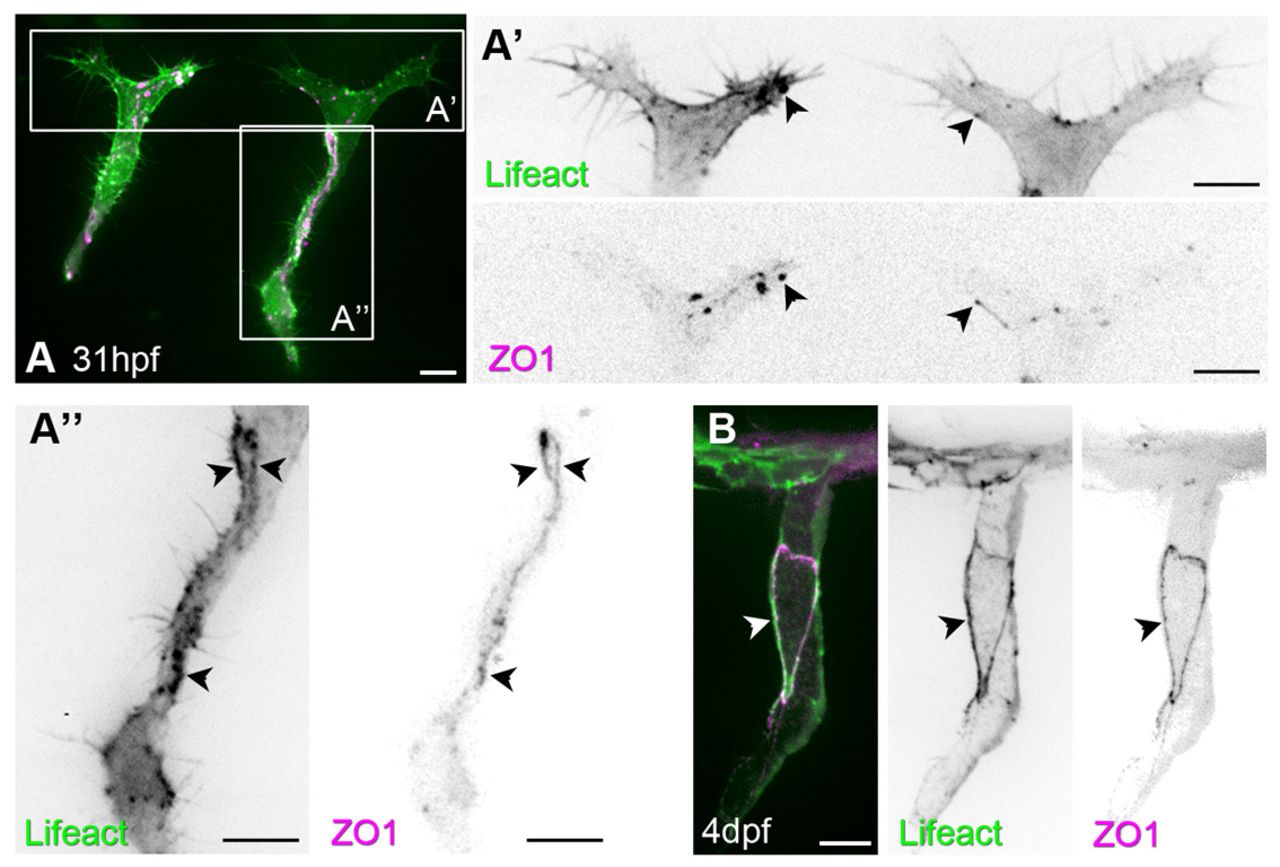 Fig. 2 F-actin polymerises at cell junctions. (A-B) Clonal expression of Lifeact-EGFP and mCherry-ZO1 in ISVs. Arrowheads indicate colocalisation of F-actin and ZO1 in puncta (A′, single plane of endothelial tip cell) and cell junctions (A′,B). Scale bars: 10 μm.