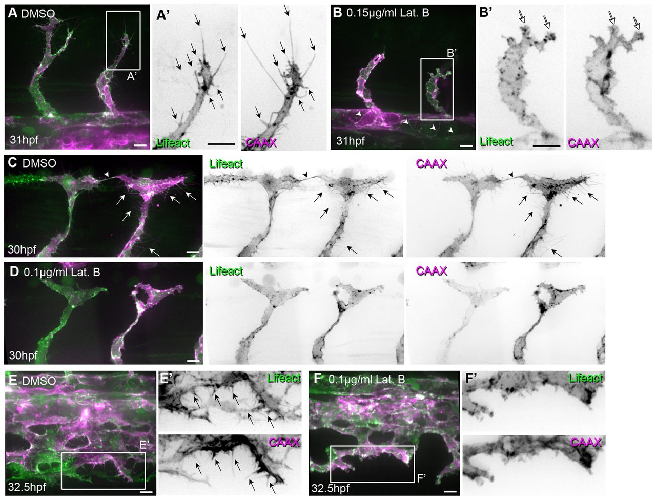 Fig. 4 Low concentrations of Latrunculin B inhibit filopodia formation. Tg(Fli1ep:Lifeact-EGFP); Tg(Kdr-l:ras-Cherry)s916 zebrafish embryos were treated with 0.4% DMSO (control) or low concentrations of Latrunculin B (Lat. B) from (A-B′) 24 to 29 hpf, (C-D′) 26 to 29 hpf or (E-F′) 26.5 to 32 hpf. (A-B′) Arrows highlight filopodia on sprouting ISVs. White arrows indicate lamellipodia-like protrusions. Arrowheads point to junctional F-actin at dorsal aorta. (C-D′) Arrows indicate filopodia. Arrowhead highlights filopodia-based contacts between two tip cells that form the DLAV. (E-F′) Arrows indicate filopodia at vein plexus. Scale bars: 10 μm.