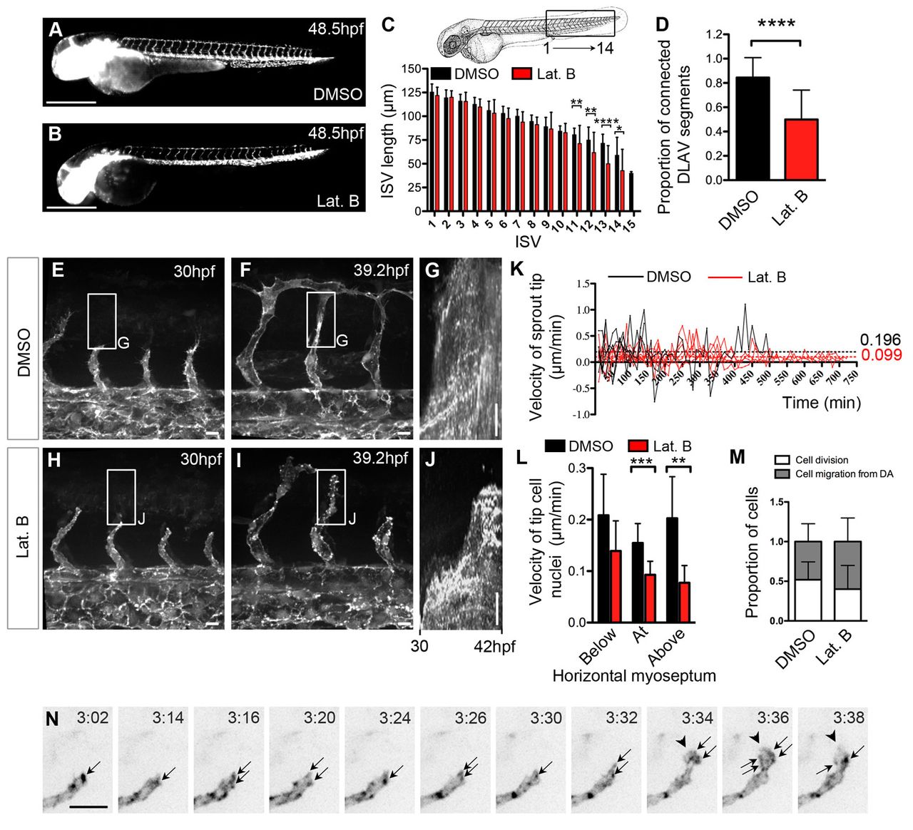 Fig. 5 Absence of filopodia decreases migration velocity but does not affect guided migration. (A-D) Tg(Fli:GFP)y1 zebrafish embryos treated with 0.4% DMSO (A) or 0.08 μg/ml Lat. B (B) from 24 to 47.5 hpf. (C) Length of ISVs between the yolk end and tail at 48.5 hpf. DMSO, n=44 embryos; Lat. B, n=39 embryos. (D) Proportion of connected DLAV segments per embryo at 48.5 hpf. DMSO, n=43 embryos; Lat. B, n=38 embryos. (E-K) Tg(Fli1ep:Lifeact-EGFP) embryos treated with either 0.4% DMSO (E,F) or 0.1 μg/ml Lat. B (H-J) from 24 hpf and imaged from 30 hpf. (G,J) Kymographs of ISVs in E and H (boxed regions) showing migration from 30 to 42 hpf. (K) Leading edge velocity of ISVs migrating above the horizontal myoseptum. Dotted lines indicate mean velocities. Negative values indicate sprout retraction. DMSO, n=5 ISVs, n=2 embryos; 0.1 μg/ml Lat. B, n=8 ISVs, n=3 embryos. (L) Average tip cell nucleus velocity per ISV below, at and above the horizontal myoseptum of embryos treated with 0.4% DMSO or 0.1 μg/ml Lat. B. DMSO, n=7-9 nuclei, n=3 embryos; 0.1 μg/ml Lat. B, n=7-10 nuclei, n=3 embryos. (M) Proportion of ECs that arise from cell division and migration from the dorsal aorta during 13.5 hours of ISV development in DMSO-treated and 0.1 μg/ml Lat. B-treated embryos. 14-15 ISVs/treatment; three embryos/treatment. (N) Migrating front of an ISV from a Tg(Fli1ep:Lifeact-EGFP) embryo treated with 0.08 μg/ml Lat. B from 26 hpf. Arrows point to clusters of F-actin formed at the leading edge of the tip cell. Arrowheads indicate lamellipodia. Time indicates hours:minutes after addition of the drug. *P<0.05, **P<0.005, ***P<0.001, ****P<0.0001. Error bars represent s.d. Scale bars: 500 μm in A,B; 10 μm in E-J,N.