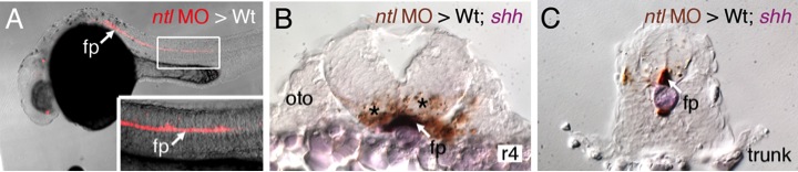 (A) Lateral view of a live 24 hpf wildtype embryo with donor-derived no tail (ntl) morphant cells (red, rhodamine and biotin dextran) in the floor plate. The embryo was then processed for shh in situ (purple) to label the floor plate and streptavidin immunochemistry (brown) to detect donorderived cells. Cross sections at the r4 (B) and trunk (C) levels show the presence of donor cells (arrows) in the floor plate. oto, otic vesicle. Asterisks in B indicate labeled cell debris from the transplantation procedure.