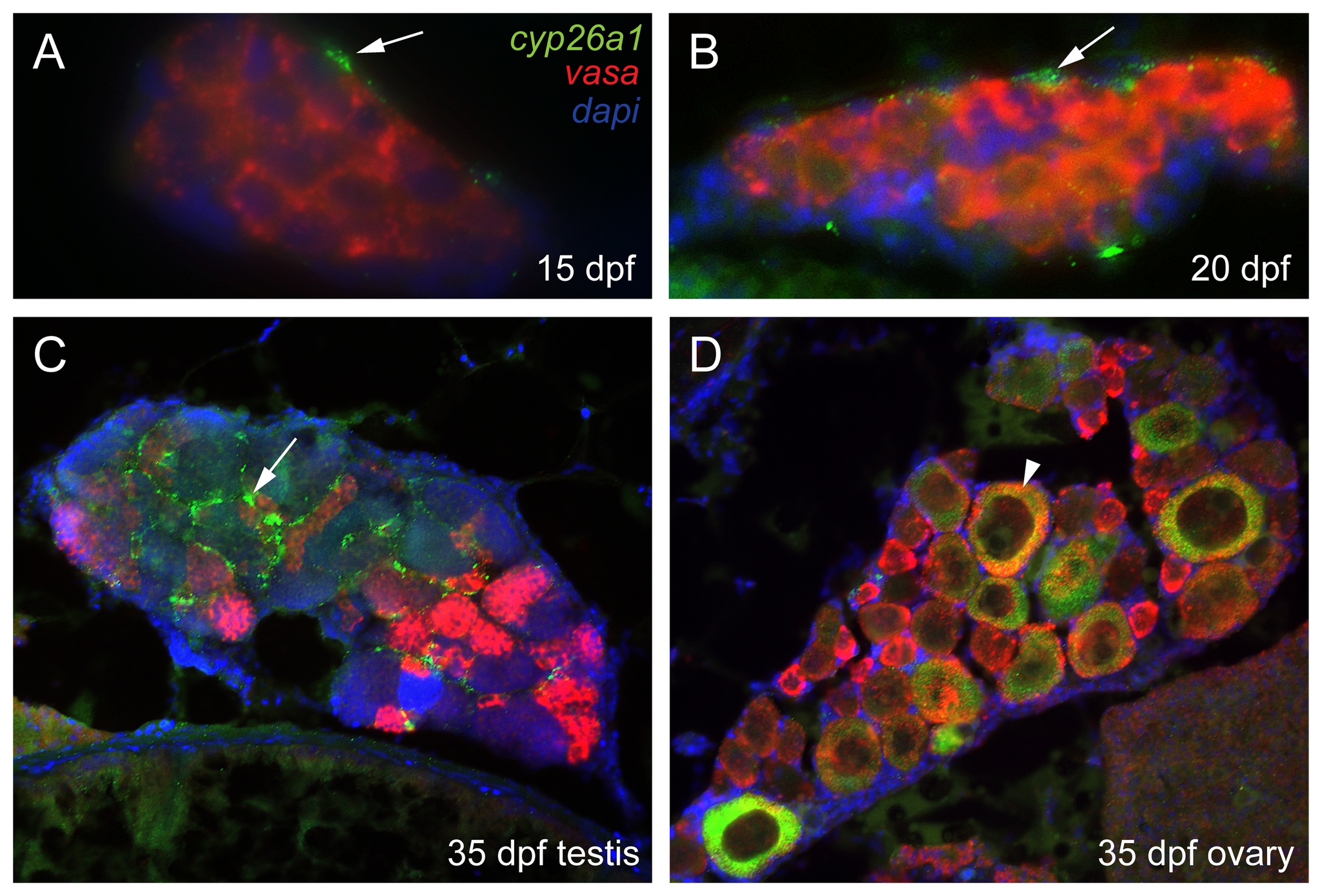 Fluorescence detection of cyp26a1 (green) expression and vasa (red) expression by double in situ hybridization on gonad sections at the bipotential gonad stage at 15 dpf (A: n=1) and 20 dpf (B: n=2), and on immature gonads developing into testes (C: n=1) or ovaries (D: n=1) at 33 dpf. Cyp26a1 expression occurs in somatic cells and does not co-localize with the germ cell marker vasa in bipotential gonads (A,B). In immature testes, cyp26a1 expression was also expressed in somatic cells (arrow) and not in germ cells (C). In immature ovaries, however, cyp26a1 was expressed in large oocytes that had reached diplotene (arrowhead in D).