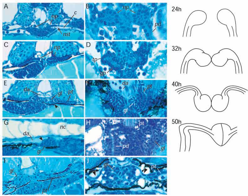 Fig. 2 Pronephric nephron development. (A) Cross section of wild-type pronephroi at 24 hpf shows the forming nephron primordium (np) as an invagination of the coelomic lining. The lumen of the nephron precursor, or nephrocoel, is still connected to the coelom (c) at this stage by a transient nephrostome (nst; arrow). (B) Sagittal section at 24 h shows the anterior pronephric duct (pd) abutting on the lateral aspect of the nephron primordium (np). C) At 32 h, the nephron primordium is closed off from the coelom and appears as a double-layered sac of cells with a central lumen. (D) A sagittal view at 32 h reveals early stages of nephron morphogenesis with lateralmost cells in the position of future tubules (tubule primordium; tp) becoming distinct from medial cells in the position of the future glomerulus (glomerular primordium; gp). (E) By 40 h, the nephron primordium has become partitioned into a glomerular domain medially directly under the dorsal aorta (da) and tubule domains laterally with a distinct basement membrane surrounding the developing glomerulus (arrow). Pigment cells envelope the pronephros at this stage. (F) A sagittal view of the 40 h pronephric nephron shows the medial paired glomeruli (gl) with the pronephric tubules (pt) fused to their posterior side. da, dorsal aorta. (G) Longitudinal sections through the forming glomerulus (gl) at 40 h show its position below the notochord (nc) and its intimate association with the dorsal aorta (da) and cells (arrow), which surround the forming glomerular basement membrane. (H) Sagittal view of the pronephros at 50 h with the glomeruli (gl) fused at the midline and the pronephric tubule (pt) arcing over to connect to the pronephric duct (pd). (I) The pronephros at 2.5 days postfertilization shows paired glomeruli (gl) ventral to the aorta and pronephric tubules (pt) connecting laterally to the pronephric ducts. (J) By 3 days, nephron formation is essentially complete and the direct connection between Bowman’s space and the lumen of the pronephric tubules is evident (arrows). On the right are schematized versions of the micrographs in B, D, F and H, derived from serial sections, illustrating the morphological transitions that occur during pronephric nephron morphogenesis. In all cross sections, the top of the figure is dorsal and in all sagittal sections the top of the figure is anterior.