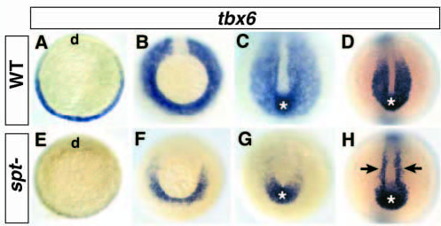 Fig. 6 spt function regulates tbx6 expression in trunk but not tail mesoderm. (A) In WT embryos at the early gastrula stage (shield, 6 h.p.f., animal pole view; d, dorsal) tbx6 expression is restricted to ventral mesoderm. During gastrulation (B; 80% epiboly, 8.3 h.p.f., vegetal view) tbx6 expression is up-regulated in the dorsolateral mesoderm, and during segmentation (C,D) tbx6 is extensively expressed in tail bud epiblast (*) and segmental plate (C, 2-4 somites, 11 h.p.f.; D, 7-8 somites, 13 h.p.f.; posterior view, dorsal uppermost). In spt- embryos, tbx6 expression is initially weak (E), remains restricted to the ventral side during gastrulation (F) and is barely detectable in the segmental plate at 2-4 somites (G). However, at 7-8 somites (H) tbx6 has a relatively normal distribution compared to WT, and is easily detected in segmental plate mesoderm (arrows) in addition to the tail bud (*).