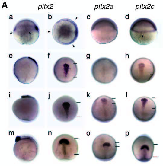 Fig. 2 (A) pitx2c is expressed in the early mesendoderm and prechordal plate, and pitx2a is expressed late in the anterior prechordal plate (polster). Expression was detected by in situ hybridization. (a,b,e,f,i,j,m,n) A full-length pitx2 probe was used to detect all pitx2 transcripts. (c,g,k,o) An isoform specific 5′-UTR probe from pitx2a. (d,h,l,p) An isoform specific 5′-UTR probe from pitx2c. (a-d) 40-50% epiboly: (a,b) pitx2 expression was observed in marginal blastomeres (arrowheads) with increased levels on the dorsal side. (c) No expression of pitx2a was detected. (d) Expression of pitx2c in marginal blastomeres (arrowhead). (e-h) 90% epiboly: (e,f) pitx2 expression in the prechordal plate. (g) No expression of pitx2a was detected. (h) pitx2c expression in the prechordal plate. (i-l) bud stage: (i,j) pitx2 expression in the polster and posterior prechordal plate. (k) pitx2a expression in the polster. (l) pitx2c expression in the polster and posterior prechordal plate. (m-p) 4-6 somites: (m,n) pitx2 expression was observed in both the polster and posterior prechordal plate. (o) pitx2a expression in the polster. (p) pitx2c expression in the polster and the posterior prechordal plate. In a,c,d,e,i,m, embryo views are lateral with dorsal to the right. In b, animal pole view is shown with dorsal to the right. In f-h, j-l and n-p, dorsoanterior views are shown with anterior at the top. Bars indicate the extent of expression in the prechordal plate along the anteroposterior axis. (B) Northern blot hybridizations using isoform-specific 5′-UTR probes on RNA isolated from staged embryos. The same blot was used in all panels. Ethidium bromide staining of 18S ribosomal RNA is shown at the bottom as a loading control.