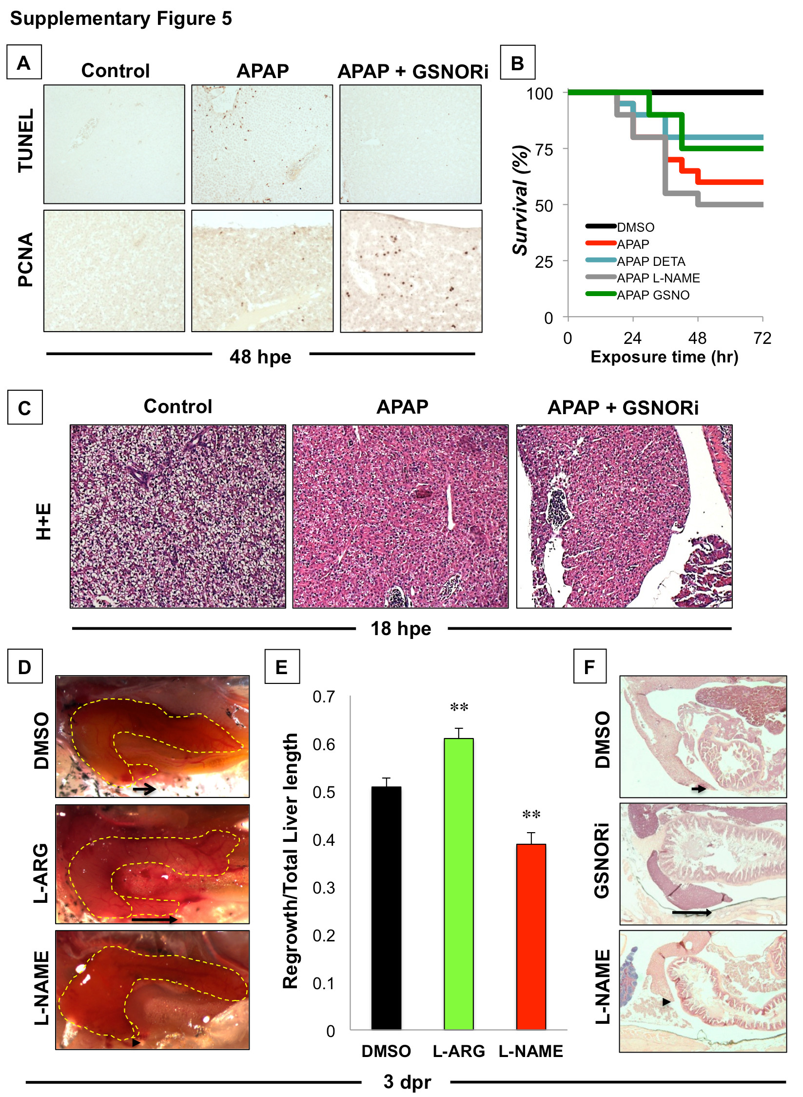 (A) Immunohistochemistry analysis of cell death (TUNEL staining) and proliferation (PCNA staining) in fish exposed to APAP (10 mM) in the presence or absence of GSNORi (1 μM) at 48 hpe. (B) Kaplan-Meier plot of survival in adult fish exposed to APAP (10 mM) for 24 hr in the presence or absence of modulators of NO signaling, including Deta (5 μM), L-NAME (10 μM) and GSNO (5 μM). Chemicals were removed 24 hpe, fish were reintroduced into fresh water and survival was monitored over 72 hr. N = 20 fish / treatment. (C) Hepatic histology (H+E staining) in nrf2 mutant fish (nfe2l2afh318) exposed to APAP (10 mM) in the presence or absence of GSNORi (1 μM) at 18 hpe. (D) Liver regeneration following partial hepatectomy in adult zebrafish exposed to modulators of NO signaling at 3 days post resection (dpr). Adult fish were exposed to DMSO, L-Arg (10 μM) or L-NAME (10 μM) 6 hr after surgery for 24 hr. Representative en bloc dissection photographs were taken at 2.5x magnification. (D) Quantification of liver regeneration as determined by the length of regrowth from the resection margin divided by the total length of the inferior lobe. N=10; ANOVA, **p<0.01. (E) Histological evaluation of liver regeneration following partial hepatectomy at 3 dpr. Fish were sectioned and stained with hematoxylin and eosin (H+E). Representative sections were taken at 2.5x magnification.
