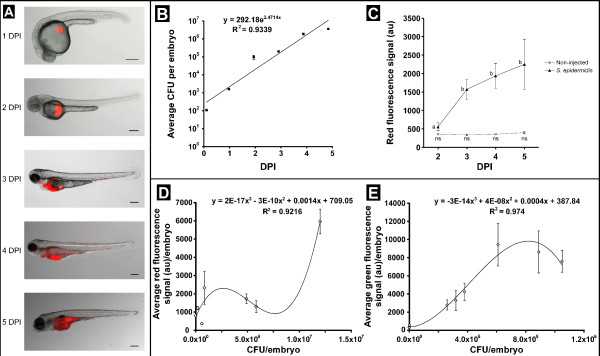 Fig. 1 Quantitation of fluorescence intensity in S. epidermidis-injected embryos using the COPAS system. Panel A: Bright field /fluorescence overlay images of mCherry-labelled S. epidermidis. Wild type zebrafish embryos injected with 100 CFU of S. epidermidis O-47 into the yolk at 2 HPF were imaged at 5 time points from 1 to 5 DPI, scale bar is 250 µm. Panel B: CFU counts of S. epidermidis-infected embryos. Groups of 10 embryos were homogenized and plated directly after injection until 5 DPI. Panel C: The graphs represent the average fluorescence intensity from the entire group of non-injected and S. epidermidis-injected embryos, from 2 DPI until 5 DPI. An increase in fluorescence intensity is visible during this infection period. (Error bars = SEM). Different letters indicate statistical significant differences (P<0.001). Panels D and E: Correlation between CFU counts and fluorescence intensity of embryos infected with mCherry-labelled (D) and GFP-labelled (E) bacteria. Pools of 10 infected embryos between 2 and 5 DPI were homogenized and plated. The average fluorescence intensity is plotted against the CFU count.