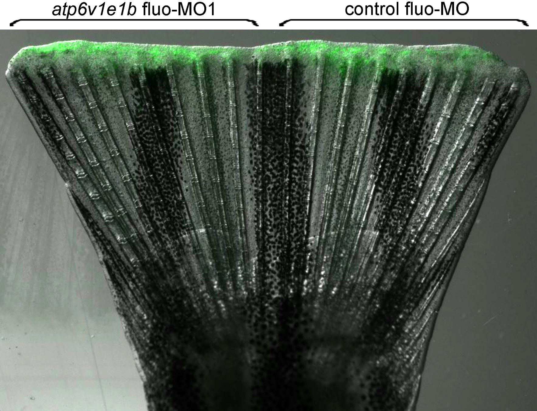 Fig. S3 Delivery of control and atp6v1e1b fluorescein-tagged morpholinos. Merged fluorescent and bright field image showing the incorporation of both control and atp6v1e1b fluorescein-tagged morpholinos into opposite regions of a regenerating fin, 24 h after delivery.