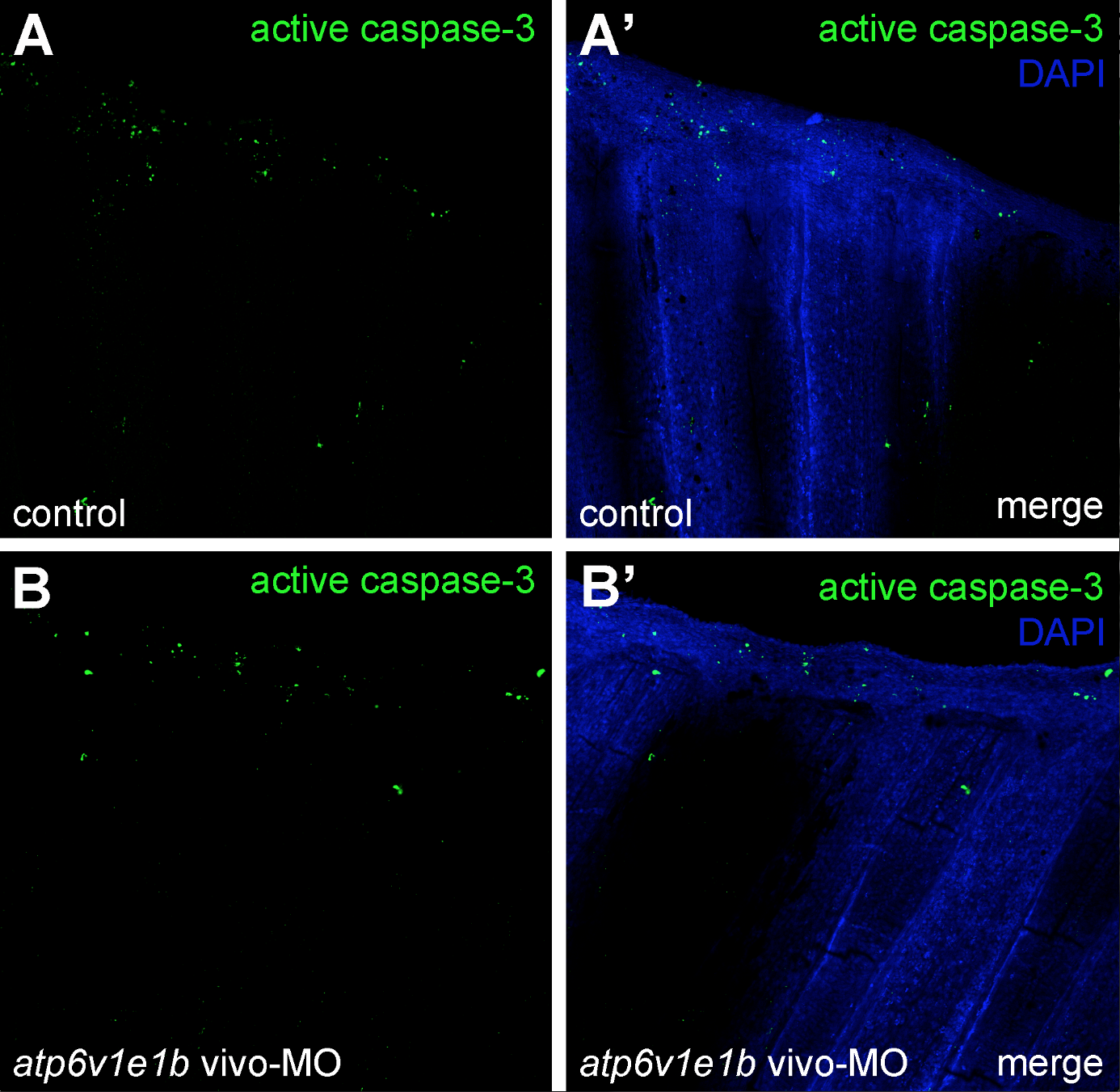 V-ATPase inhibition does not affect apoptosis during regeneration. atp6v1e1b knockdown didn′t affect cell proliferation by 24 hpa compared to the control (compare Figures A-A′ with B-B′).