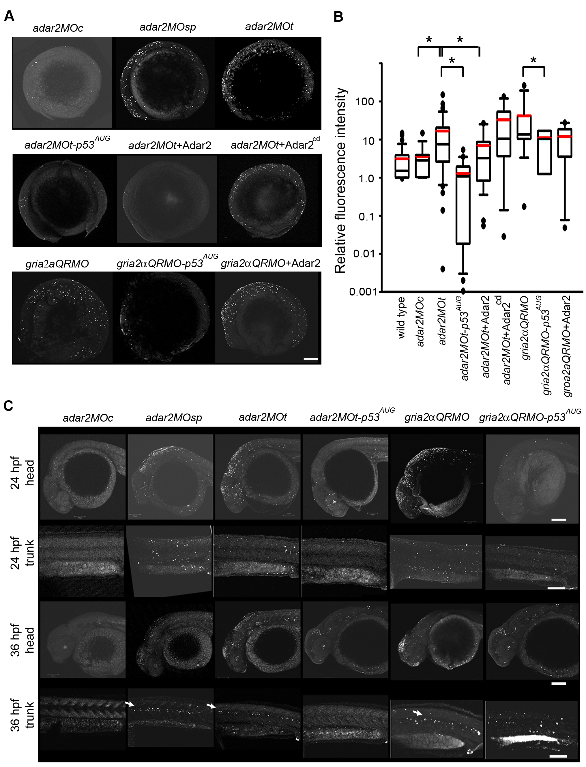 (A) Apoptosis at the 5-somite stage. Representative images, except those co-injected with p53-MOAUG, were selected from the ones showing the mean fluorescence intensities in the TUNEL (terminal deoxynucleotidyl transferase-mediated dUTP nick end-labeling) analysis. The anterior is to the left, and dorsal side is to the top. Top panel shows the adar2MOc, adar2MOsp and adar2MOt. Middle panel shows adar2MOt co-injected with p53AUG morpholino to block p53 activity, with adar2 cRNA (Adar2) and with adar2cd cRNA (Adar2cd). The bottom panel shows gria2αQRMO, and the gria2αQRMO co-injected with p53AUG and with adar2 cRNA. (B) Tukey box plot of the relative TUNEL signals at 5-somite stage. Boxes represent 50% inter quartile values. Black and red lines respectively mark the median and mean intensities. Outliers are marked as dots. All signals were normalized to a wild-type embryo, showing mean intensity, stained in the same batch (relative fluorescence intensity). The total embryos included in the analysis are 8 adar2MOc (2 batches), 42 adar2MOt (9 batches), 19 adar2MOt-p53 AUG (3 batches), 20 adar2MOt+Adar2 (3 batches), 12 adar2MOt+Adar2cd (3 batches), 9 gria2αQRMO (3 batches), 7 gria2αQRMO-p53AUG (3 batches) and 5 gria2αQRMO+ Adar2 (2 batches). (C) Increased p53-dependent apoptosis in specific regions of the 24- and 36-hpf hypo-Q/R-editing morphants. Lateral views of head and trunk at 24 and 36 hpf. Arrows indicate the apoptotic cells along the horizontal myoseptum. Scale bars represent 100 μm.