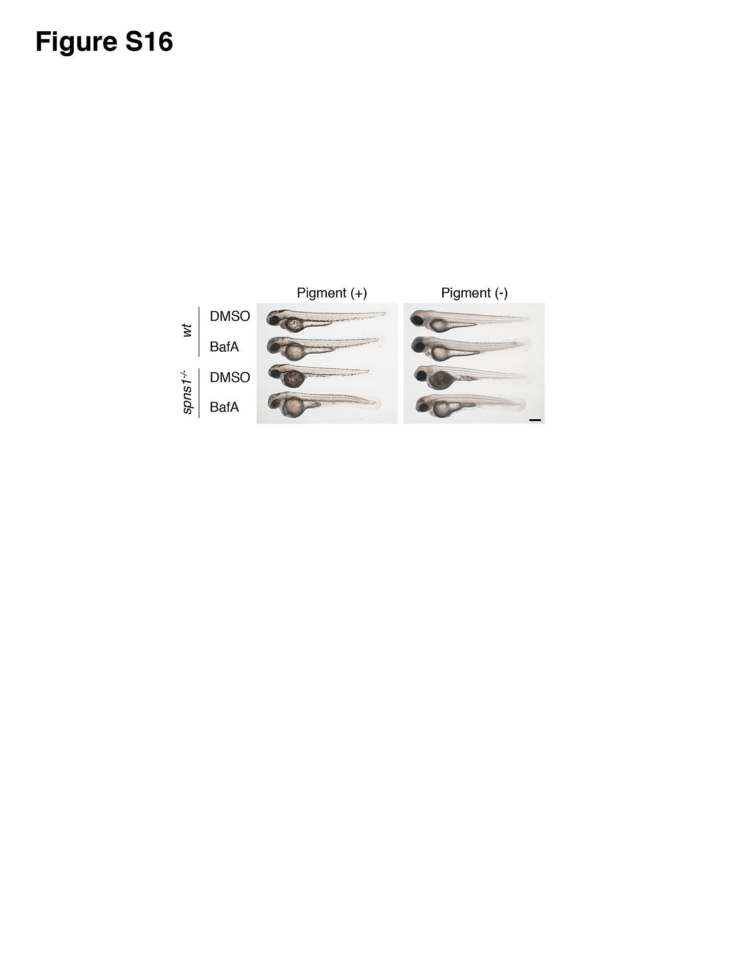 Suppression of spns1-mutant phenotypes by BafA treatment in zebrafish embryos. Suppression of yolk opacity by treatment with BafA (200 nM; 12 h treatment from 48 hpf through 60 hpf) in pigmented (AB line) and unpigmented (casper line) zebrafish embryos is shown. Scale bar, 250 μm.