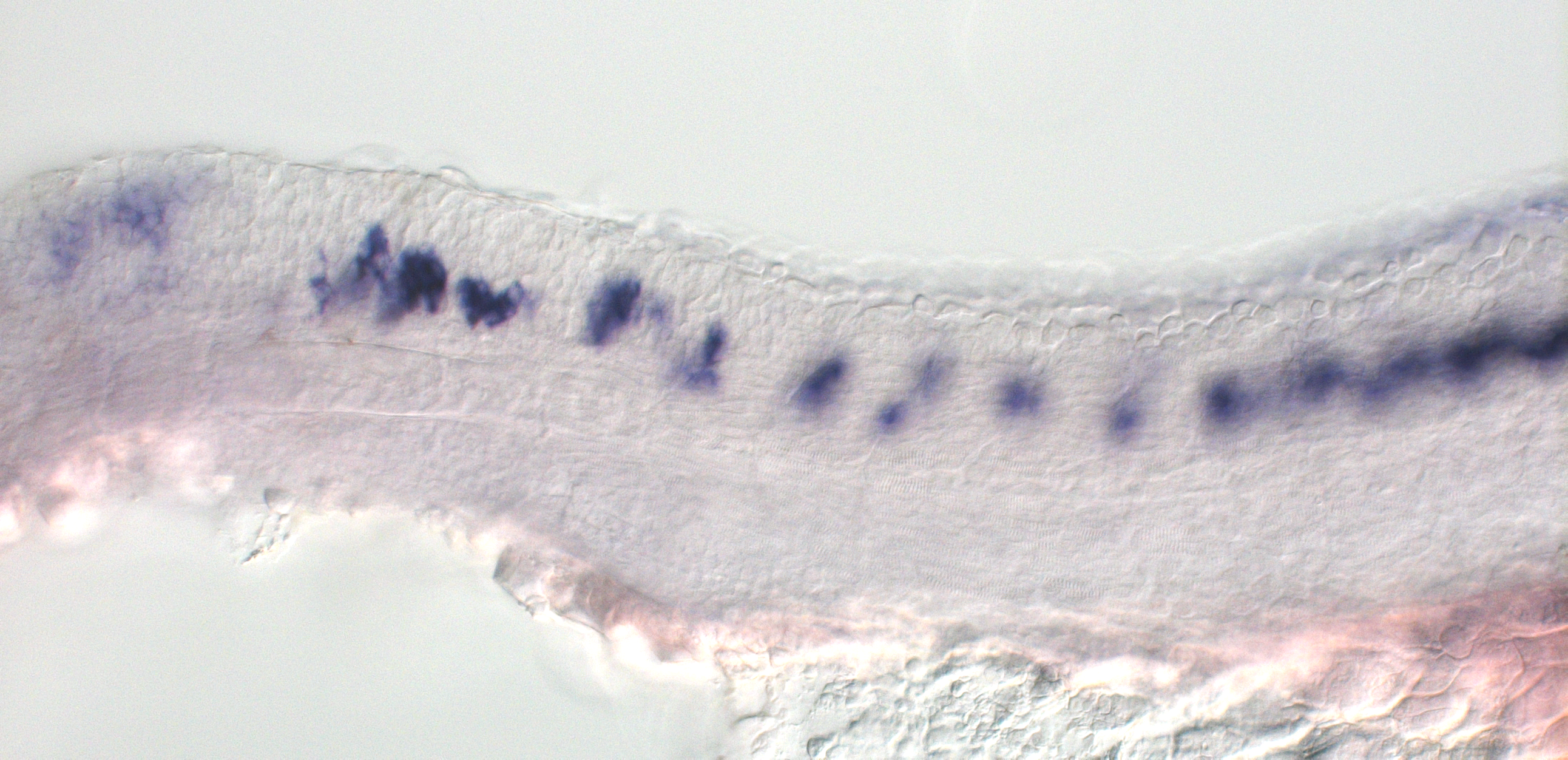 Fig. 27 mindbomb1ta52b mutant. Prim-5 (24 hpf). Probe synthesis and in situ hybridisation was performed as described in England et al., Identifying Transcription Factors Expressed by Ventral Spinal Cord Interneurons. ZFIN on-line publication, 2014. Primer sequences were: Forward: ACACAGAACCCGTCCAGAAC. Reverse: AATTAACCCTCACTAAAGGGAGCGCTTTTAACCTCCAGATG. PCR product size: 883 bp.