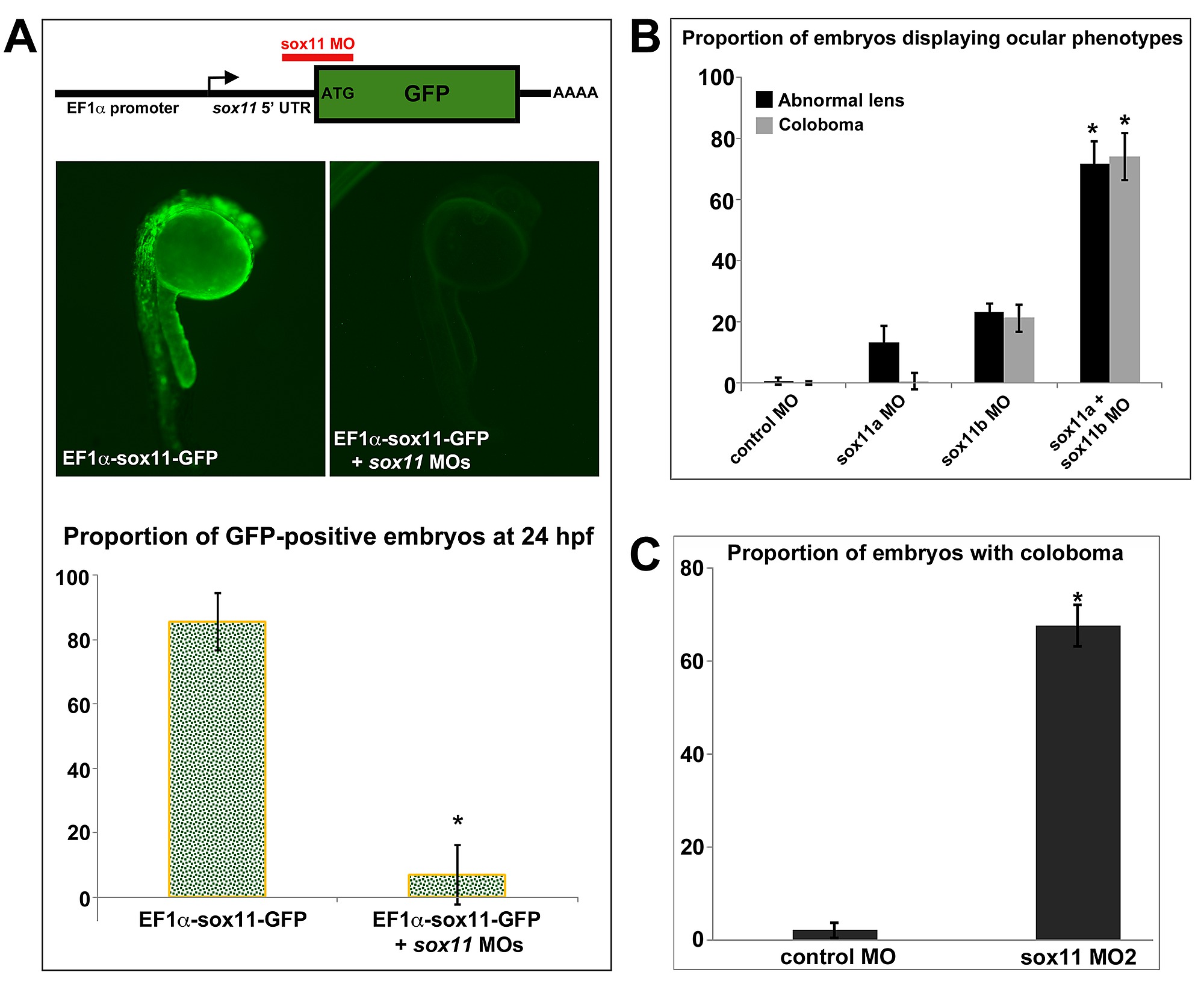 Efficiency and specificity of sox11 morpholinos. (A) Schematic representation of the pEF1α:GFP plasmid containing a portion of the sox11 52 UTR placed upstream of the GFP reporter (top). The binding site for the sox11 morpholino is shown in red. Separate reporters were constructed for the sox11a and sox11b MOs. (Center) Lateral view (anterior at top) of 24 hpf embryos injected with EF1α- sox11a/b-GFP plasmids alone (left) or with both sox11 MOs. No GFP expression was detected in the embryo injected with sox11 MOs. (Bottom) Quantification of the proportion of GFP-positive embryos at 24 hpf. The sox11 MOs were highly effective at blocking GFP expression. Number of embryos analyzed: pEF1α-sox11-GFP plasmid alone, n = 169; pEF1α-sox11-GFP + sox11 MOs, n = 140, 3 independent repeats; *p = 0.004, Student′s t-test. (B) Both sox11a and sox11b contribute to abnormal lens and coloboma phenotypes observed in sox11 morphants. The proportion of embryos displaying either phenotype was significantly higher when injected with sox11a and sox11b MOs simultaneously, compared to either MO alone. Number of embryos analyzed: 24 hpf control MO, n = 463; 2 dpf control MO, n = 441; 24 hpf sox11a MO, n = 229; 2 dpf sox11a MO, n = 214; 24 hpf sox11b MO, n = 341; 2 dpf sox11b MO, n = 316; 24 hpf sox11a + sox11b MO, n = 271; 2 dpf sox11a + sox11b MO, n = 262, 3 independent repeats. *p<0.001, Fisher′s exact test. (C) A second non-overlapping sox11 MO (that targeted both sox11a and sox11b simultaneously) produced the same coloboma phenotype in similar proportion to the first set. Number of embryos analyzed: control MO, n = 186 embryos; sox11 MO, n = 194, 3 independent repeats; *p<0.001, Fisher′s exact test. MO, morpholino; hpf, hours post fertilization; dpf, days post fertilization.