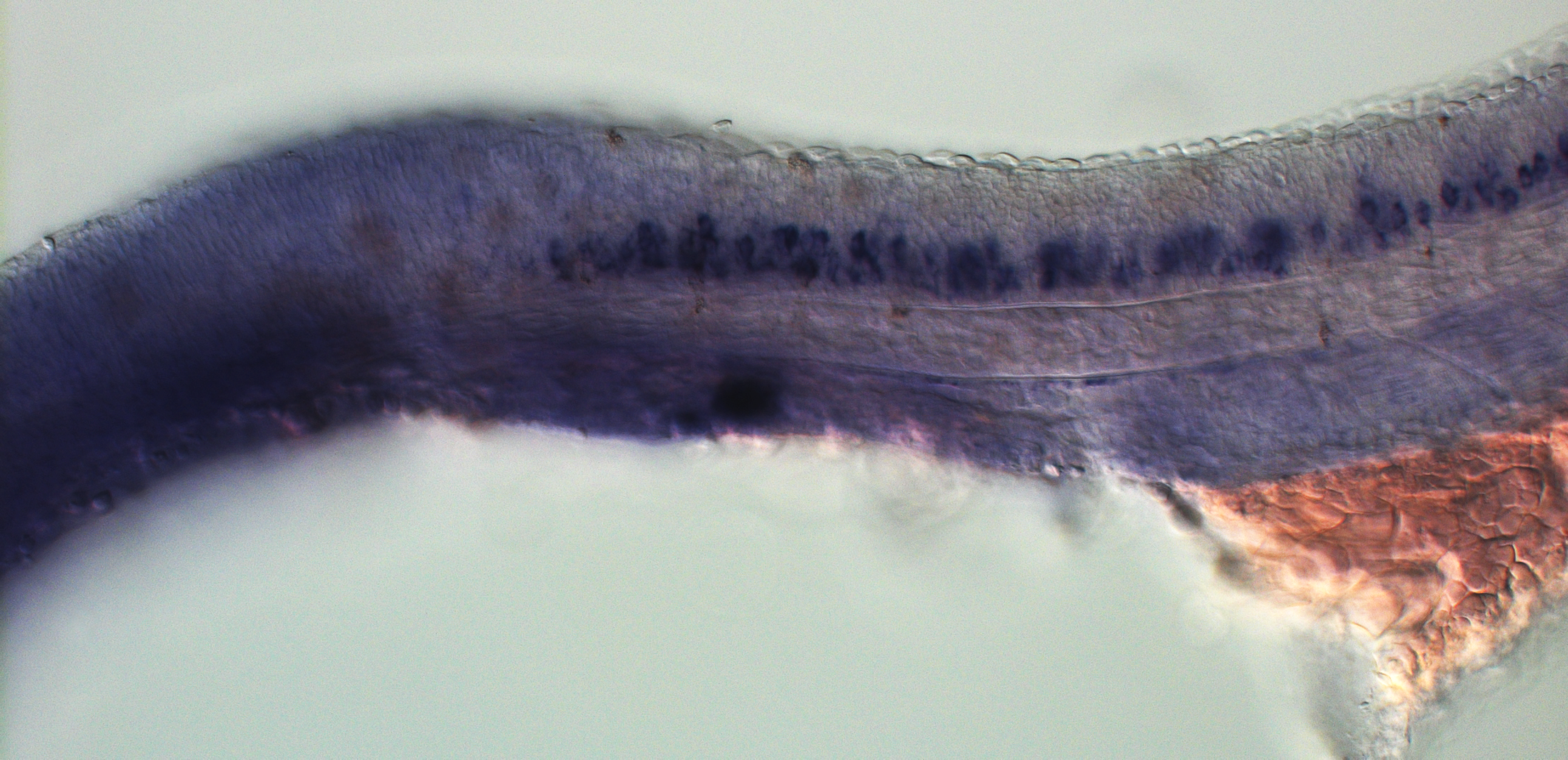 Fig. 19 Wild-Type. Prim-10 (27 hpf). Probe synthesis and in situ hybridisation was performed as described in England et al., Identifying Transcription Factors Expressed by Ventral Spinal Cord Interneurons. ZFIN on-line publication, 2014. Primer sequences were: Forward: TCCATATCCTCCTCTTCCGACAG. Reverse: AATTAACCCTCACTAAAGGGATGTCATTGGTTCGTTCATCCTCAG. PCR product size: 817 bp.