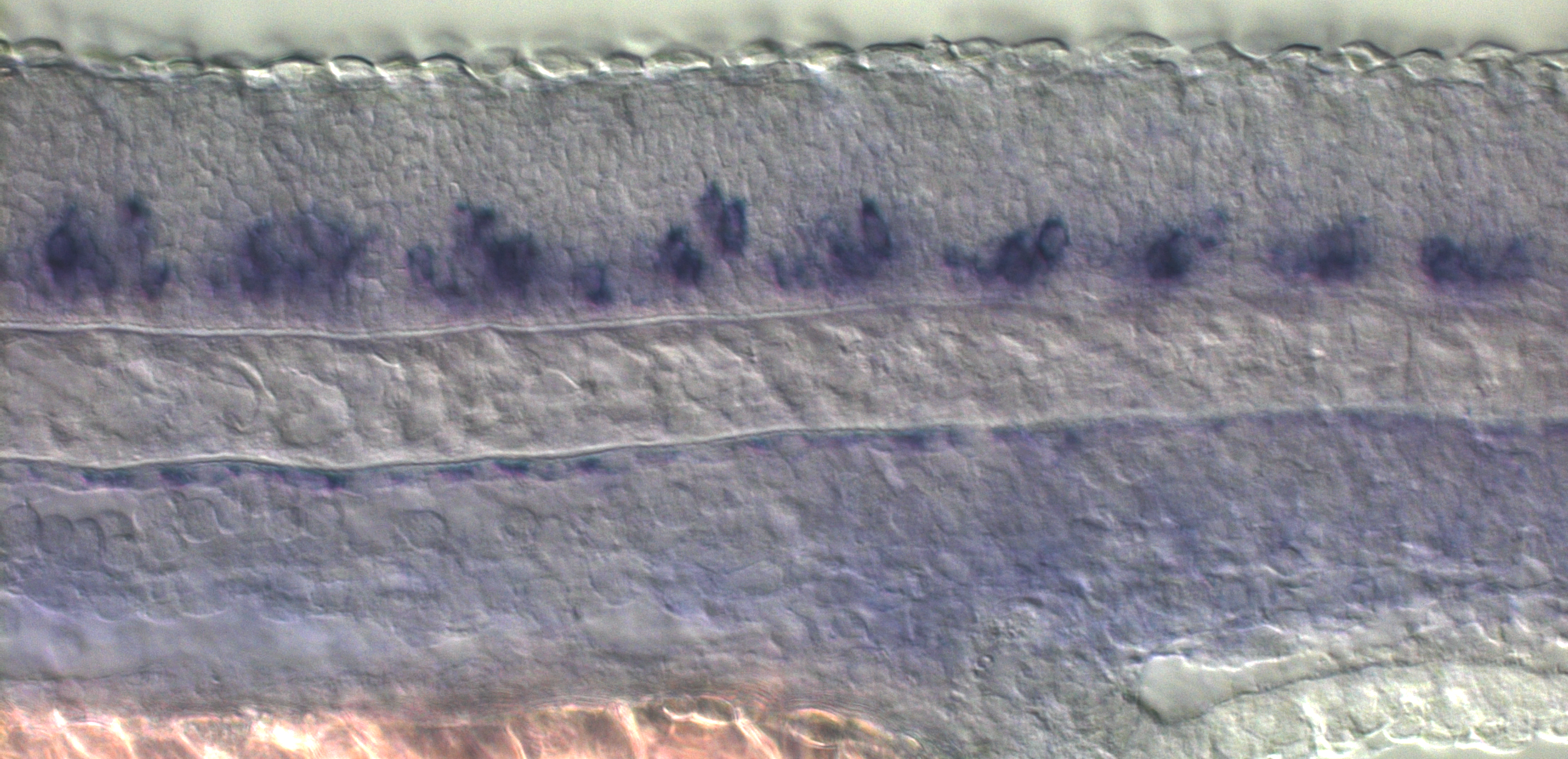 Fig. 19 Wild-Type. Prim-10 (27 hpf). Probe synthesis and in situ hybridisation was performed as described in England et al., Identifying Transcription Factors Expressed by Ventral Spinal Cord Interneurons. ZFIN on-line publication, 2014. Primer sequences were: Forward: TCCATATCCTCCTCTTCCGACAG. Reverse: AATTAACCCTCACTAAAGGGATGTCATTGGTTCGTTCATCCTCAG. PCR product size: 817 bp.