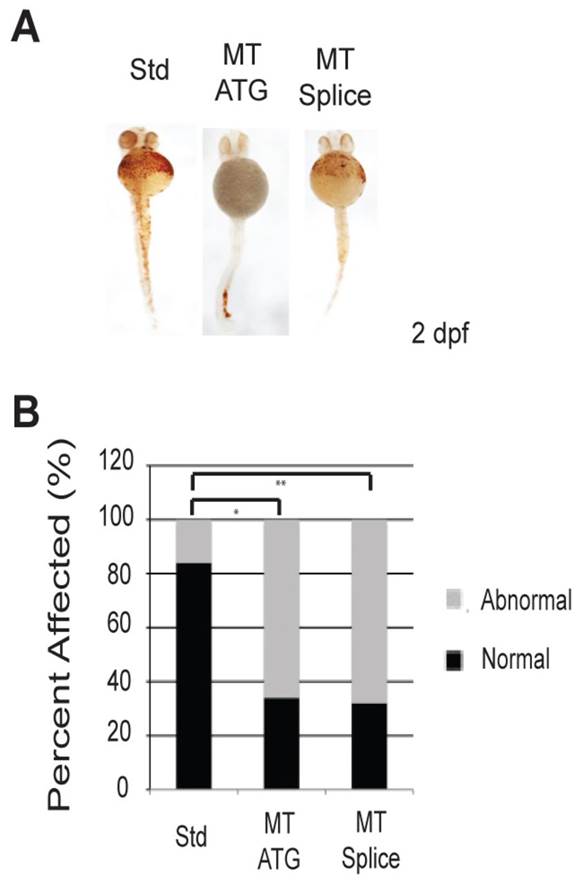 Loss of etv7 causes a marked reduction in hemoglobinized red blood cells. (A) etv7 morphants stained with o-dianisidine at 2 dpf. Std represents embryos injected with 8.2 ng of standard control morpholino, MT ATG are embryos injected with 8.2 ng of translation-blocking morpholino, and MT Splice are embryos injected with 4.1 ng of splice-site morpholino. Normal embryos were classified by the presence of adequate heme staining according to o-dianisidine, and fish with reduced heme staining are classified as abnormal. (B) Quantitation of A (MT ATG n=44, Std n=44, MT Splice n=34). *Pd0.0001, **Pd0.0001.