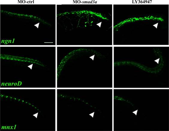 Fig. 7 In vivo blocking of Smad3/TGFbeta; signaling impairs neuronal differentiation during early embryonic development. Confocal Z-stack tail images of 24 hpf transgenic embryos expressing GFP under control of neuronal promoter: ngn1, neuroD, and mnx1. Embryos were injected with morpholinos for smad3a at 1–2 cell stage or treated at 2 hpf with Alk5-inhibitor LY364947. As shown with an arrowhead, morpholinos and drug treatment give similar results: increase of proliferative cells (ngn1) at tail tip, decrease of differentiating cells (neuroD) and reduction of late differentiating motor neurons (mnx1). ngn1 is Tg(ngn1:GFP)sb1. neuroD is Tg(2.4 kb neurod:EGFP). mnx1 is Tg(hlxb9:GFP)ml2. Quantification of each frame is shown in Supplemental Table S3. Scale bar is 100 µm in all the images.