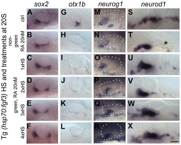 Tg(hsp70:fgf3) embryos were treated with DMSO (A,G,M,S) or 20 nM RA from 20S and the first heat shock applied at the same time. Embryos were heat shocked never (A,G,M,S), once (1×HS; C,I,O,U), twice (2×HS; D,J,P,V), three times (3×HS; E,K,Q,W) or four times (4×HS; F,L,R,X) and sorted as non-green non-transgenic siblings (B,H,N,T) or green transgenic embryos (C–X). Non-green non-transgenic siblings were pooled; different HS treatments did not affect the phenotype (B,H,N,T). (A,G,M,S) Tg(hsp70:fgf3) embryos treated with DMSO show normal expression of the sensory marker sox2 (A) and the non-neurogenic marker otx1b (G) and the otic markers neurog1 (M) and neurod1 (S). (B) In non-green sibling embryos treated with 20 nM RA, the expression of sox2 extends across the ventral OV floor. (C–F) In Tg(hsp70:fgf3) embryos treated with 20 nM RA and given 1×HS (C) or 2×HS (D), the expression of sox2 is present in two extended domains at the anterior and posterior of the OV. (E) In Tg(hsp70:fgf3) embryos treated with 20 nM RA and 3×HS the expression of sox2 is normal or slightly reduced. (F) In Tg(hsp70:fgf3) embryos treated with 20 nM RA and 4×HS the expression of sox2 is slightly reduced or normal; the posterior domain of expression is shifted laterally. (H) In non-green sibling embryos treated with 20 nM RA, the expression of otx1b is reduced. (I–L) In Tg(hsp70:fgf3) embryos treated with 20 nM RA and given 1×HS (I), 2×HS (J), 3×HS (K) or 4×HS (L), the expression of otx1b is greatly reduced. (N) In non-green sibling embryos treated with 20 nM RA, the expression of neurog1 is reduced in the OV. (O,P) In Tg(hsp70:fgf3) embryos treated with 20 nM RA and given 1×HS (O) or 2×HS (P), the expression of neurog1 is reduced in the OV. (Q) In Tg(hsp70:fgf3) embryos treated with 20 nM RA and 3×HS the expression of neurog1 is normal but slightly shifted towards posterior. (R) In Tg(hsp70:fgf3) embryos treated with 20 nM RA and 4×HS the expression of neurog1 is increased but shifted to a more posterior position in the floor of the OV. (S,T) In non-green sibling embryos treated with 20 nM RA, the expression of otic neurod1 is slightly increased, while expression is lost in prospective posterior lateral line and vagal ganglion cells posterior to the OV (asterisk). (U–W) In Tg(hsp70:fgf3) embryos treated with 20 nM RA and given 1×HS (U), 2×HS (V) or 3×HS (W) the expression of neurod1 is increased in the OV. In embryos heatshocked three times neuroblasts emerge in a more posterior position in the OV floor (W). (X) In Tg(hsp70:fgf3) embryos treated with 20 nM RA and 4×HS the expression of neurod1 is increased and otic neuroblasts emerge from a more posterior position in the floor of the OV. In addition, neurod1-positive cell populations re-emerge below the OV. All panels are lateral views with anterior to the left. For numbers see Table 1. Scale bar: 50 µm.