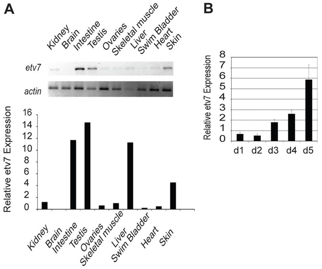 etv7 is expressed in the adult and developing zebrafish. (A) Semi-quantitative RT-PCR of etv7 mRNA of adult zebrafish tissues. actin is provided as a positive loading control. Quantification of the etv7 signals relative to actin is shown below. (B) Quantitative real-time PCR measuring the level of etv7 expression during the first 5 days of development. All values are relative to day 0, which is 4 hpf. d1=day 1 post-fertilization etc. Error bars represent standard deviation.
