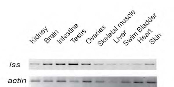 Fig. S4 Expression of lss in adult zebrafish tissues. Semi-quantitative RT-PCR of lss mRNA in adult zebrafish tissues. actin is provided as a positive loading control.