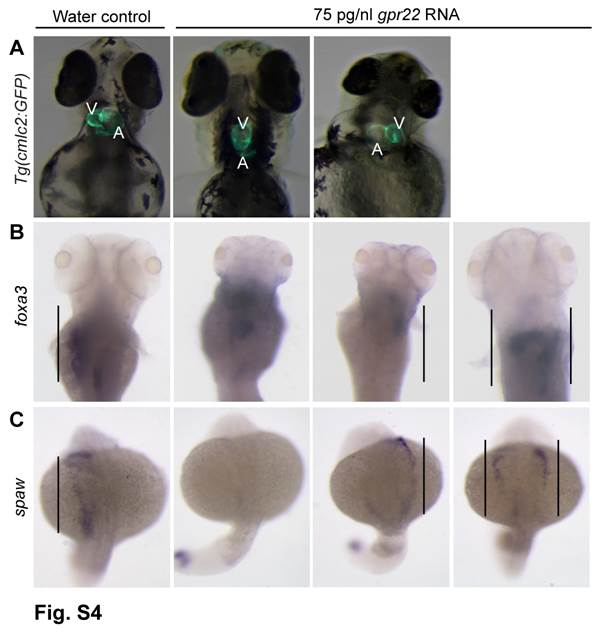 gpr22 overexpression results in defective LR patterning. (A) Ventral or (B, C) dorsal views with anterior to the top of embryos at (A, B) 4 dpf or (C) 20 somite stage. (A) Transgenic embryos expressing GFP under control of the cmlc2 promoter. gpr22 overexpression results in (from left to right) normal, absent, reversed or bicardial cardiac looping (not shown). (B) WISH for foxa3. The liver of water injected control embryos develops at the left side of the embryo. In contrast, the position of the liver in embryos injected with gpr22 RNA is randomized (straight line). (C) WISH for southpaw (spaw). The expression of the early LR marker southpaw is randomized in gpr22 injected embryos (straight line). V = ventricle, A = atrium, dpf = days post-fertilization, GFP = green fluorescence protein, cmlc2 = cardiac myosin light chain type 2, LR = left-right, WISH = whole mount in situ hybridization.