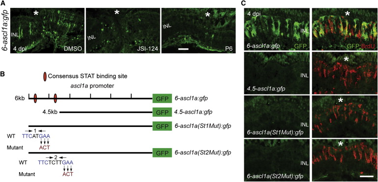 (C) GFP immunofluorescence shows that a distal 1.5 kb fragment of the ascl1a promoter is required for injury-dependent transgene expression and that both consensus Stat3 sites located in this promoter fragment are necessary for this expression. BrdU+ cells indicate the injury site and a normal regenerative response. The asterisk marks the injury site (needle poke). Scale bar, 50 µm.