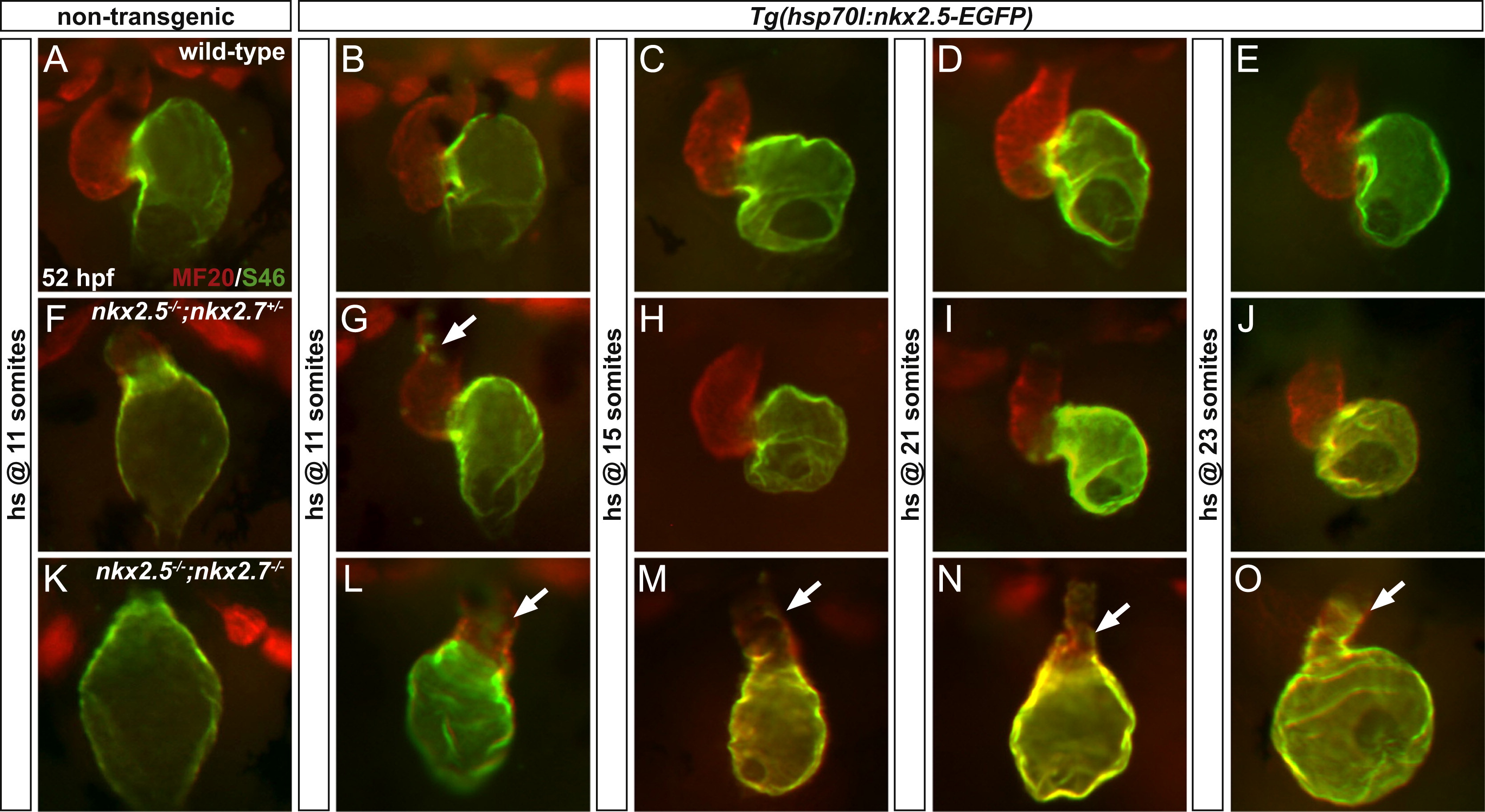 Resupplying nkx2.5 in nkx2.5/;nkx2.7/ embryos reveals dose-dependent functions of nkx genes. Frontal views, anterior to the top, of MF20/S46 immunofluorescence (as in Fig. 3) at 52 hpf. In non-transgenic wild-type (A) and Tg(hsp70l:nkx2.5-EGFP) embryos (B-E), cardiac morphology and chamber-specific identity are maintained following heat shock at 11 somites through 23 somites. In contrast, non-transgenic nkx2.5-/-;nkx2.7+/- (F) and nkx2.5-/-;nkx2.7-/- (K) embryos have enlarged atrial chambers, underdeveloped or indiscernible ventricular chambers, and diminished outflow tracts. Following heat shock at the same time points as performed in the wild-type embryos, transgenic nkx2.5-/-;nkx2.7+/- embryos (G-J) exhibit substantial improvement in ventricular chamber size with only a few residual ectopic S46+ cardiomyocytes remaining in embryos treated at 11 somites (G). However, only moderate rescue of abnormalities in morphology and identity is achieved in the transgenic nkx2.5-/-;nkx2.7-/- embryos following heat shock at 11 somites and 15 somites (L,M) and only minimal rescue is achieved following heat shock at 21 somites and 23 somites (N,O). White arrows indicate ectopic S46+ cardiomyocytes.
