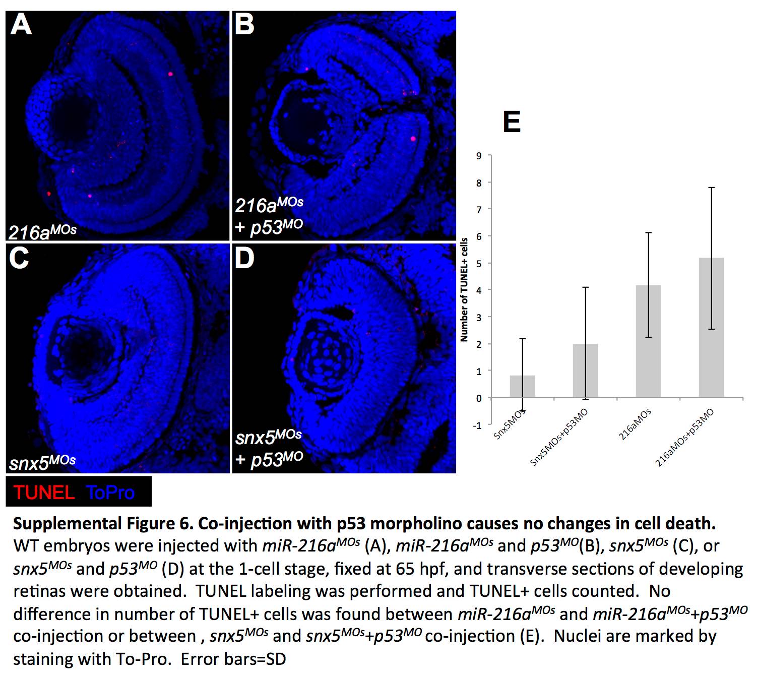 Co-injection with p53 morpholino causes no changes in cell death. WT embryos were injected with miR-216aMOs (A), miR-216aMOs and p53MO (B), snx5MOs (C), or snx5MOs and p53MO (D) at the 1-cell stage, fixed at 65 hpf, and transverse sections of developing retinas were obtained. TUNEL labeling was performed and TUNEL+ cells counted. No difference in number of TUNEL+ cells was found between miR-216aMOs and miR-216aMOs+p53MO co-injection or between, snx5MOs and snx5MOs+p53MO co-injection (E). Nuclei are marked by staining with To-Pro. Error bars = SD.
