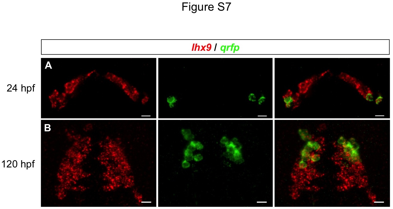 Fig. S7 Expression of endogenous qrfp and lhx9. Confocal projections of WT embryos at 24 and 120 hpf show that all qrfp-expressing cells express lhx9, as determined by double fluorescent ISH. Ventral images are shown. Scale = 10 µm.