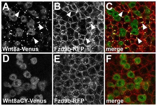 Single confocal section showing a mosaic expression of Wnt8a-Venus (A–C) or Wnt8aCY-Venus (D–E) in embryos injected with Fzd9b-mRFP mRNA. Co-expression of Wnt8a-Venus and Fzd9b-mRFP induces the formation of membrane clusters which contain both proteins (arrowheads in A–C). Cluster formation is not observed after co-expression of Wnt8aCY-Venus with Fzd9b-mRFP (D-E). (A,D) Green channel, (B,E) red channel, (C,F) overlay.