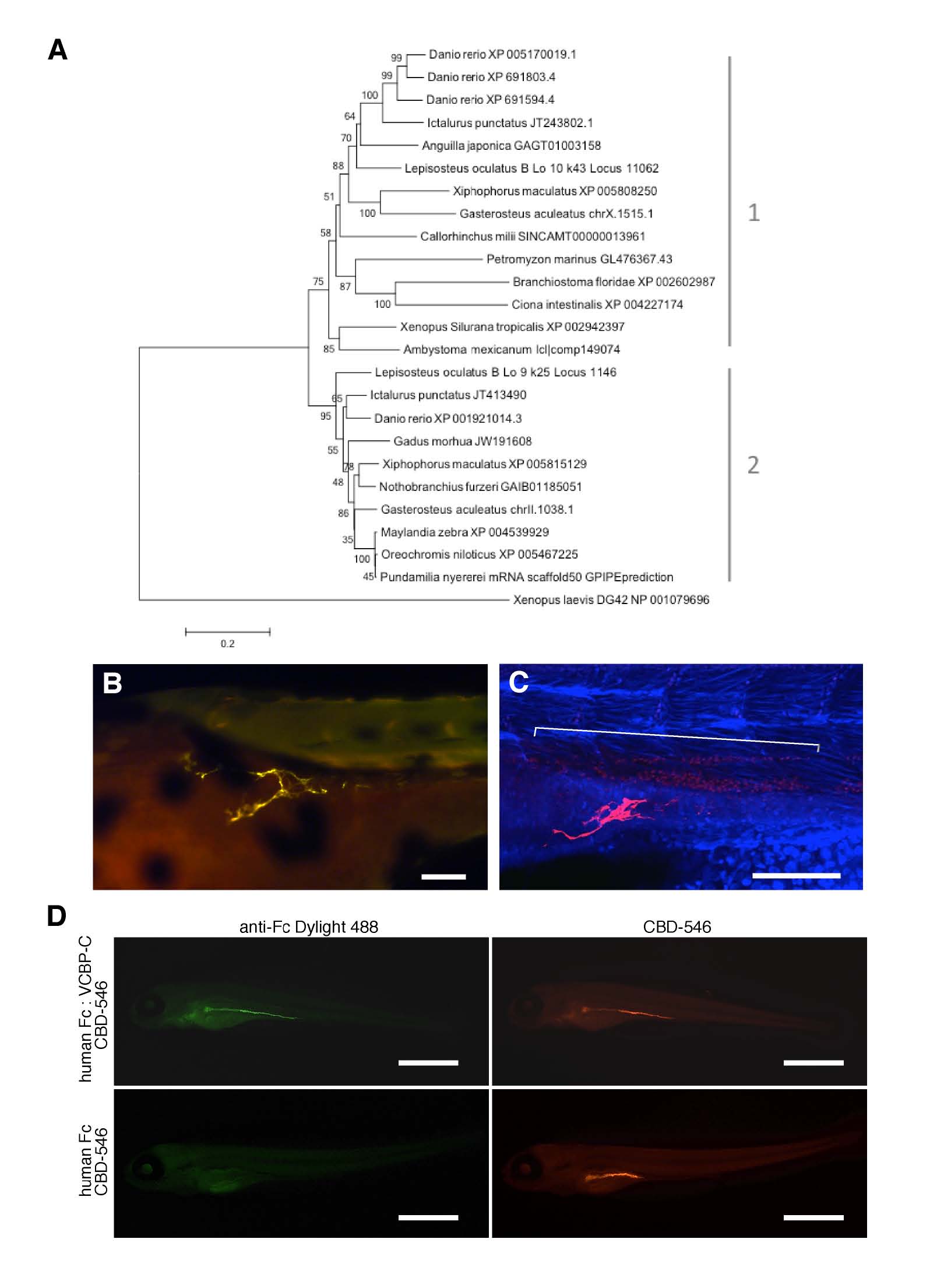 Evolutionary relationships of vertebrate chitin synthases, chitin in 3 dpf zebrafish larvae, and validation of the CBD probe specificity.