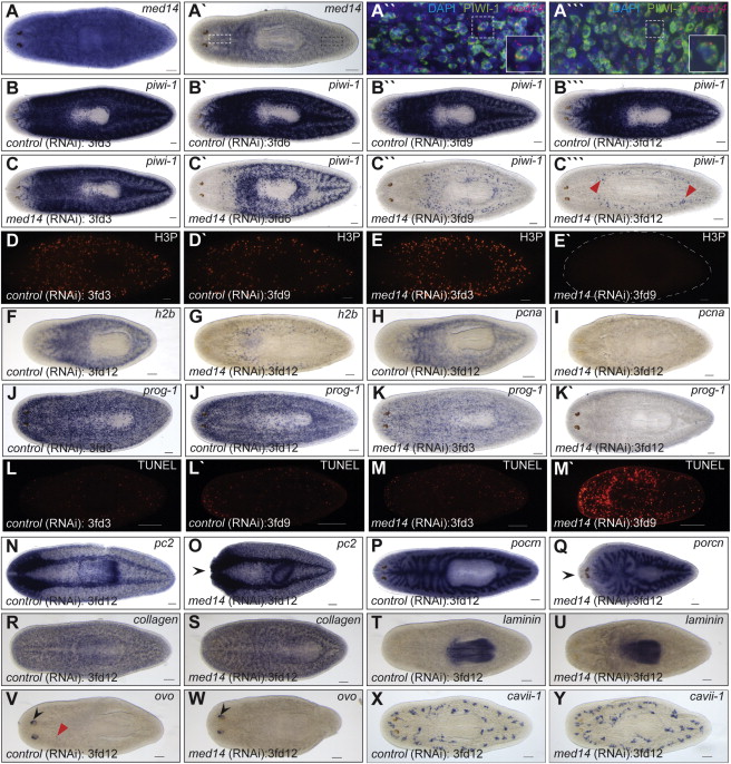 (A′′ and A′′′) Confocal image at 25× magnification of med14 fluorescent RNA ISH (red) and PIWI antibody staining (green) in the planarian head (white dashed box in A2) and tail (black dashed box in A′) respectively. The boxed area in each is enlarged for clarification. med14 is expression in, but not limited to, the stem cell population.
