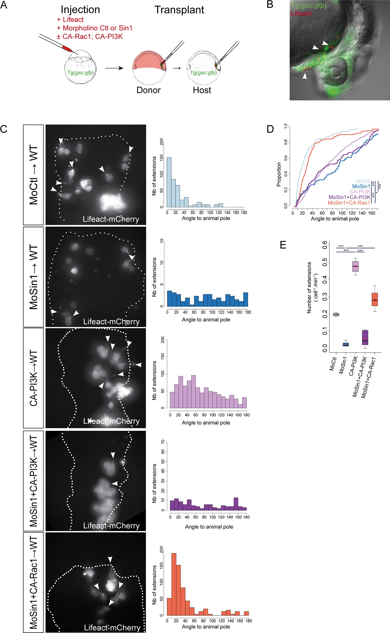 (A) Diagram of the design of prechordal plate cell transplantation. Cells were labelled with Lifeact-mCherry and transplanted from shield to shield. (B) At 24 hpf, sin1 morphant cells transplanted into wild-type prechordal plates take part to the hatching gland. (C) Cells injected with Lifeact-mCherrry RNAs and either a control morpholino, or the sin1 morpholino, or CA-PI3K RNAs, or the sin1 morpholino and CA-PI3K RNAs, or the sin1 morpholino and CA-Rac1 RNAs were transplanted from shield to shield in Tg(-1.8gsc:GFP) embryos. Transplanted cells are within the prechordal plate (assessed by GFP expression), and contour of the plate is delineated (white dotted line). Orientations of their cytoplasmic extensions were measured relative to the animal pole and plotted as histograms (C) and cumulative plot in (D). (E) Frequencies of cytoplasmic extensions.