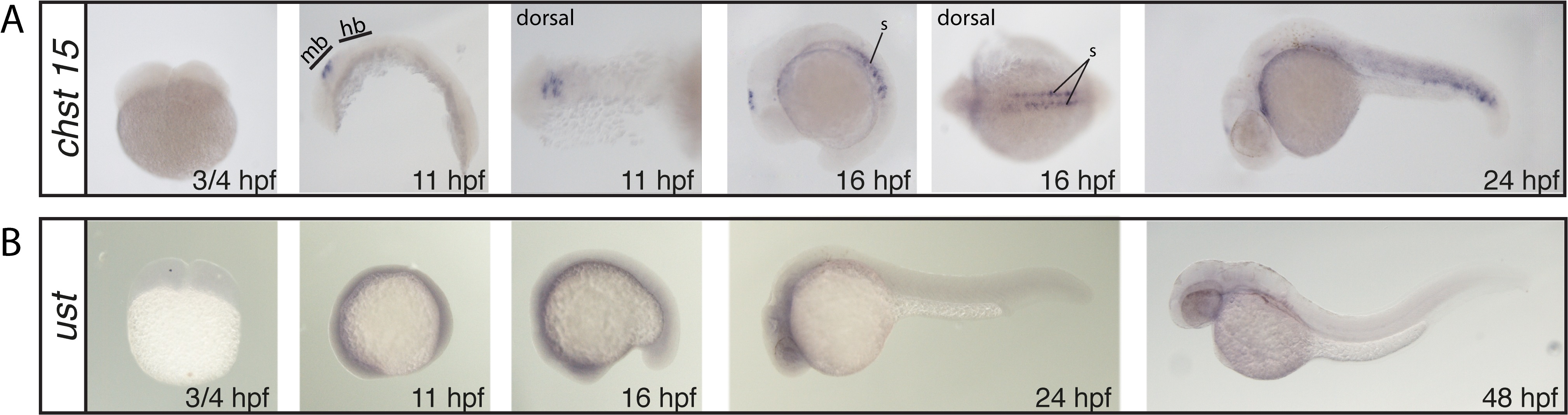 Fig. 5 Whole mount in situ hybridization of N-acetylgalactosamine 4-sulfate 6-O-sulfotransferase, chst15 (A) and CS/DS 2-O-sulfotransferase, ust (B).