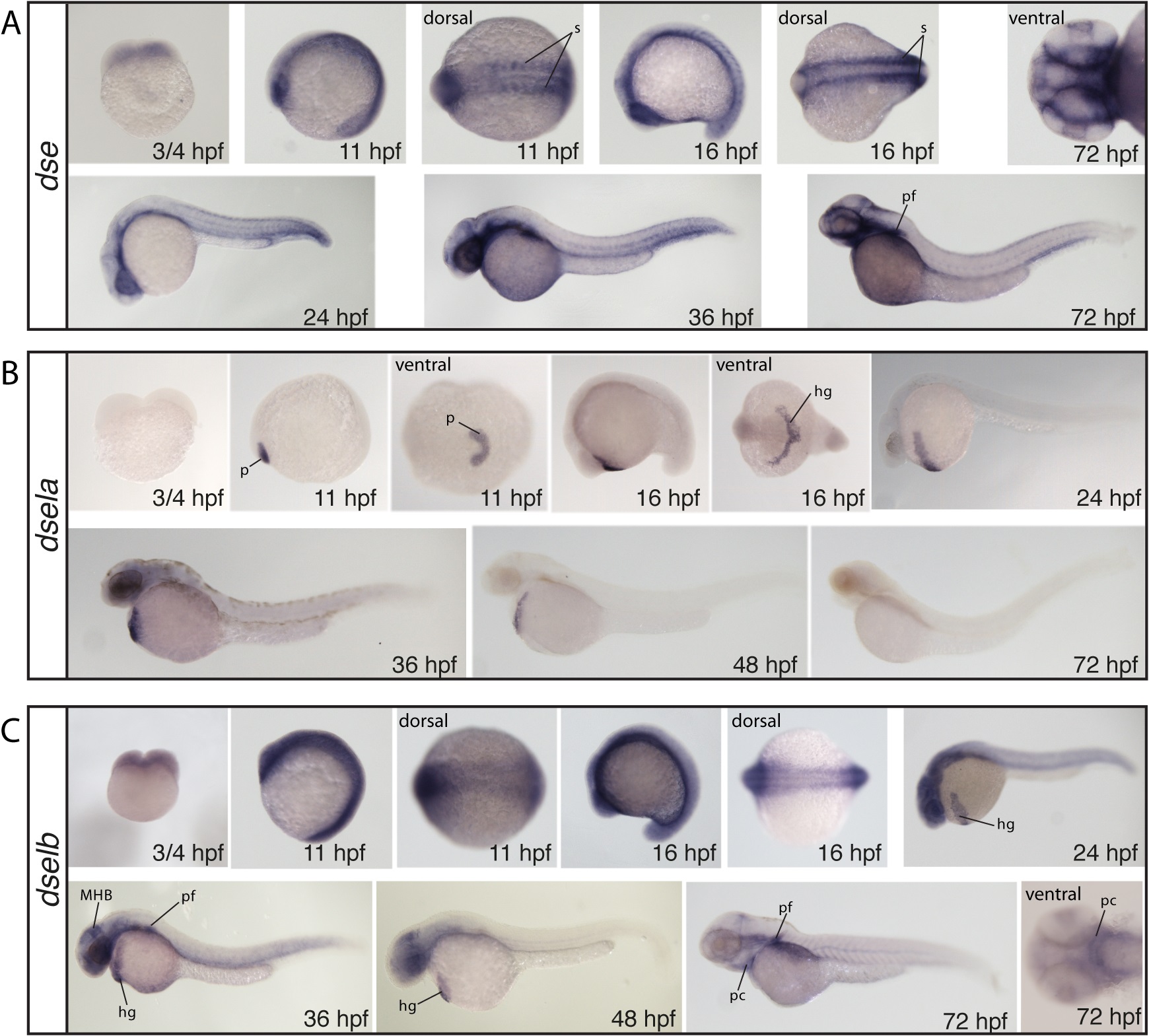 Fig. 6 Whole mount in situ hybridization of the DS epimerases dse (A), dsela (B) and dselb (C).