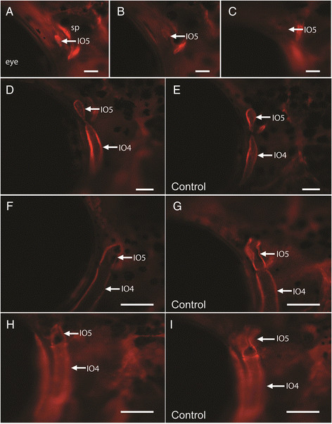 Laser ablation of the IO5 condensation in a transgenic juvenile osterix:mcherry zebrafish. (A) Before ablation IO5 condensation occurs anterior to the sphenotic (sp); (B) immediately after ablation the IO5 condensation is not present and does not fluoresce; (C) 24 hours post-ablation the IO5 condensation is still not present. The arrow in A-C indicates the posterior edge of IO5 condensation, the dark space anterior to the element is the eye. The other two bright regions are the anterior and anterodorsal edges of the spenotic (sp) which begins to ossify shortly before IO5. (D) by 4 days post-ablation a IO5 condensation has reformed (arrow) and touches the IO4 condensation unlike the control-side (E) in which the IO4 and IO5 are separate condensations; (F) the IO5 continues to grow at 2 weeks post-ablation and is still closely associated with IO4; it appears less developed (lacking canal walls) compared to the control side shown in (G). Two months following IO5 condensation ablation, the IO5 element is morphologically different to the control-side, compare (H) the ablation side to (I), the control side. The ablated side (H) lacks the anterodorsal flat-wing extension and canal walls are not approaching each other compared to control-side (I) Lateral view, anterior is to the left, Scale bars are (A-C) 50 µm and (D-I) 25 µm.