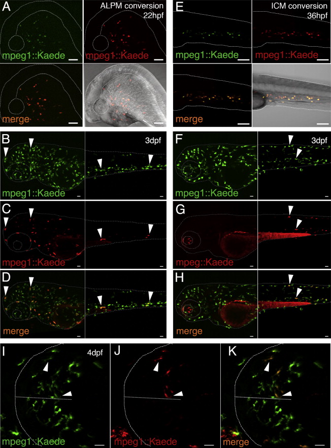 (E) Photoconversion of ICM macrophages. Side views of a 36-hpf photoconverted embryo (mpeg1::Kaede) are shown (arranged as in A).