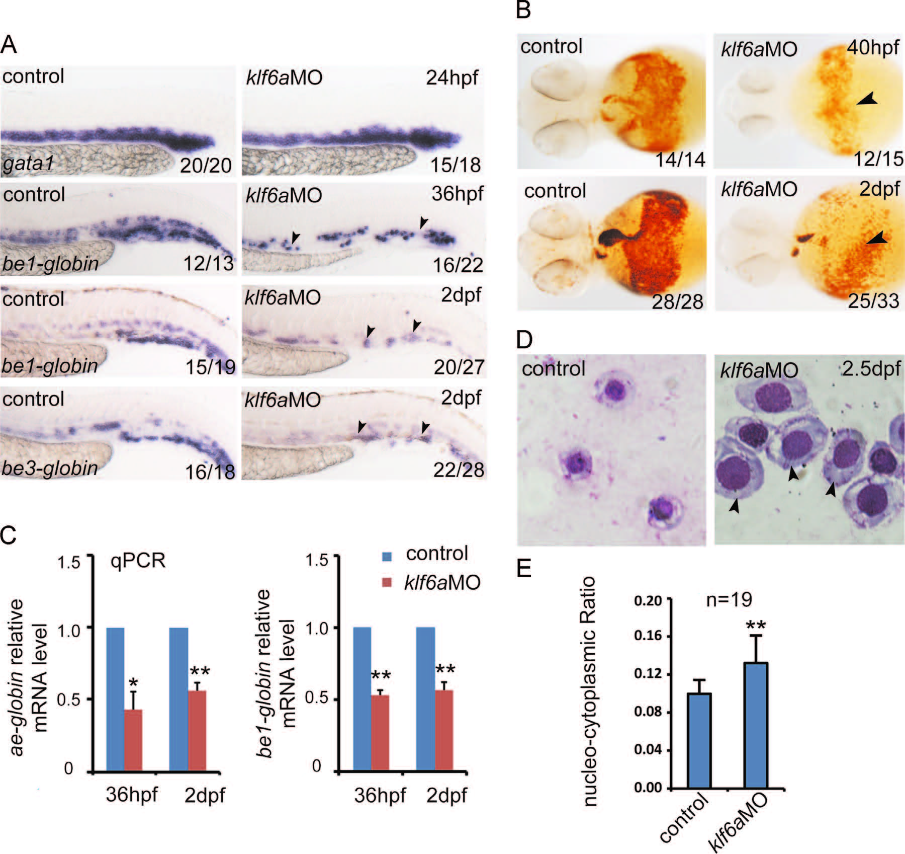 klf6a knockdown induces a blockage of erythroid cell differentiation and maturation. (A) WISH results showed that gata1 expression was comparable between controls and klf6a morphants from 24 hpf. The expression of be1-globin and be3-globin was decreased in klf6a morphants, compared with controls at 36 hpf and 2 dpf. (B) The number of o-dianisidine-positive cells (marked by arrowheads) decreased dramatically in klf6a morphants between 40 hpf and 2 dpf. (C) The real time PCR results displayed that ae1-globin and be1-globin were downregulated in klf6a morphants at 36 hpf and 2 dpf (mean±SD, *P <0.05, **P <0.01, n=3). (D) Giemsa staining of erythroid cells from the blood of controls and klf6a morphants at 2.5 dpf. The size and nucleo-cytoplasmic ratio of red blood cells in klf6a morphants were noticeably larger than those of controls. The arrowhead marks the delayed erythroid progenitor. (E) Quantification of the nucleo-cytoplasmic ratio between controls and klf6a morphants (mean±SD, NNP <0.01, n=19).