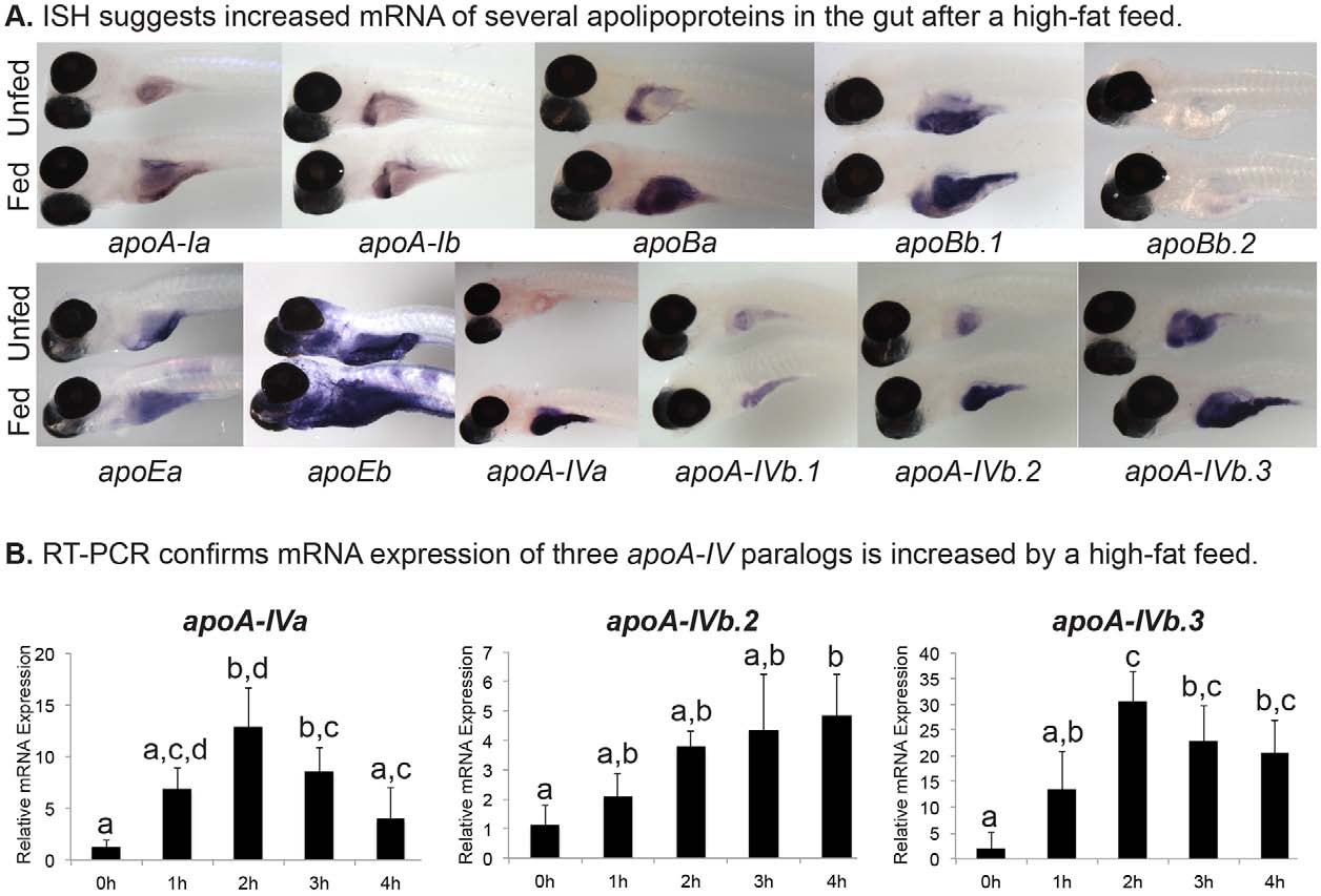 High-fat feed increases expression of apolipoproteins in larval gut. (A) Representative images of mRNA expression as observed by ISH of the zebrafish apoA-I, apoB, apoE and apoA-IV genes in 6-dpf nacre-/- larvae. Larvae have either never eaten exogenous food (Unfed), or have been fed a high-fat, 5% chicken egg yolk meal for 4 hours (Fed). ISH was performed in triplicate with n≥5 larvae; no staining was observed in sense probed (supplementary material Figs S1-S4). (B) A high-fat meal increases zebrafish apoA-IVa, apoA-IVb.2, and apoA-IVb.3 mRNA expression in the gut (intestine, liver, pancreas). Real-time PCR quantification of apolipoprotein transcriptional response in the 6-dpf zebrafish gut to 1, 2, 3 or 4 hours of a 10% chicken egg yolk feed (n=3; 10 pooled larval guts per experiment). Groups with the same letter are not significantly different (one-way ANOVA, P<0.05, n=3).